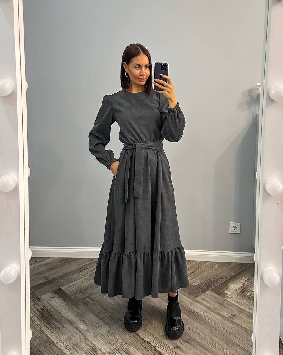Елегантне довге плаття з м’якої приємної тканини, яке забезпечує комфорт та вишуканий вигляд на кожен день. Модель має припущений об’ємний рукав, манжети на резинці та пояс, який красиво підкреслює талію.