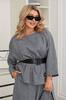 Костюм складається з двох предметів – вільного верху та широких штанів. Верх: це простора туніка із прямим кроєм та рукавами 3/4. Вона доповнена чорним ременем на талії з широкою пряжкою, що підкреслює силует і створює баланс між об'ємним верхом та фігурою.
