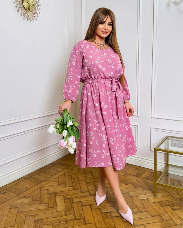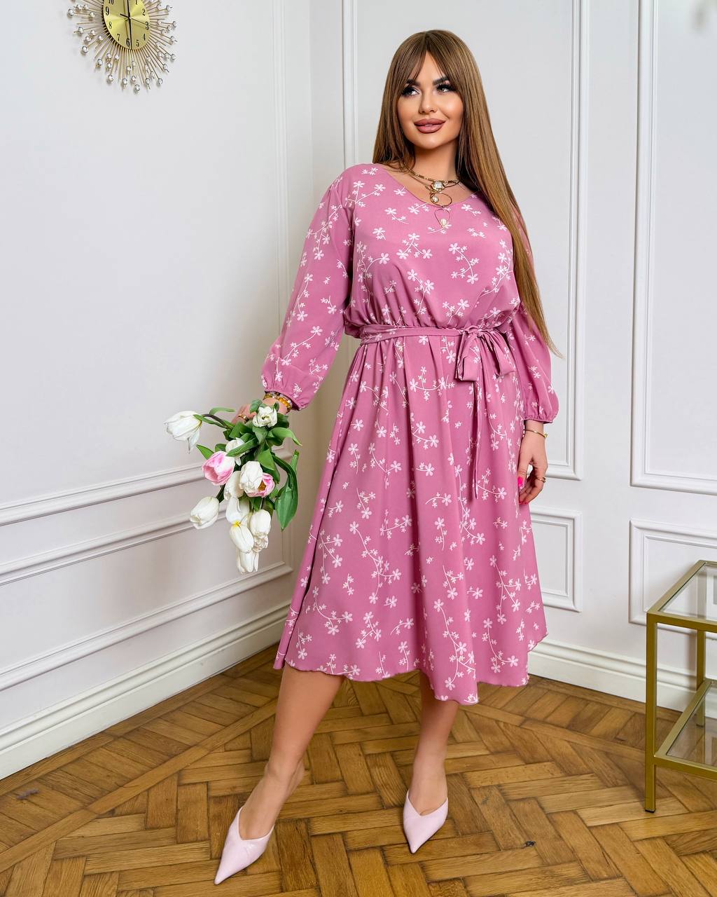 Сукня має вільний крій із акцентом на талії, що підкреслює силует і додає ніжності образу. Довжина міді робить модель універсальною — як для щоденних прогулянок, так і для святкових подій.