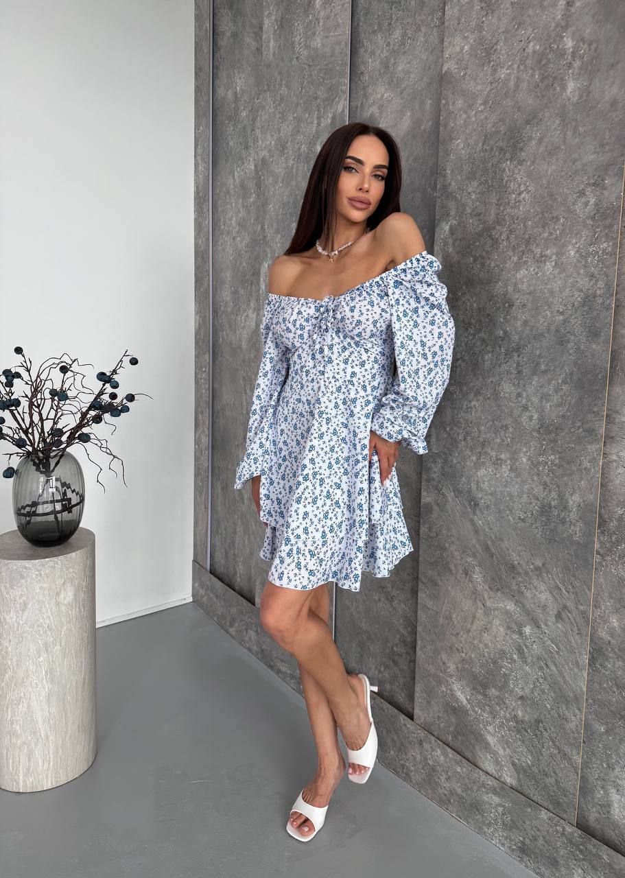 Дизайн: Сукня має актуальний фасон з відкритими плечима (анжеліка) та довгими об'ємними рукавами, що додає образу легкості.