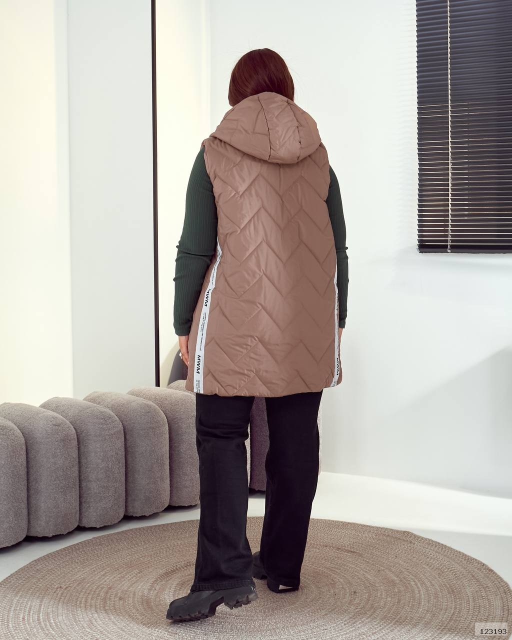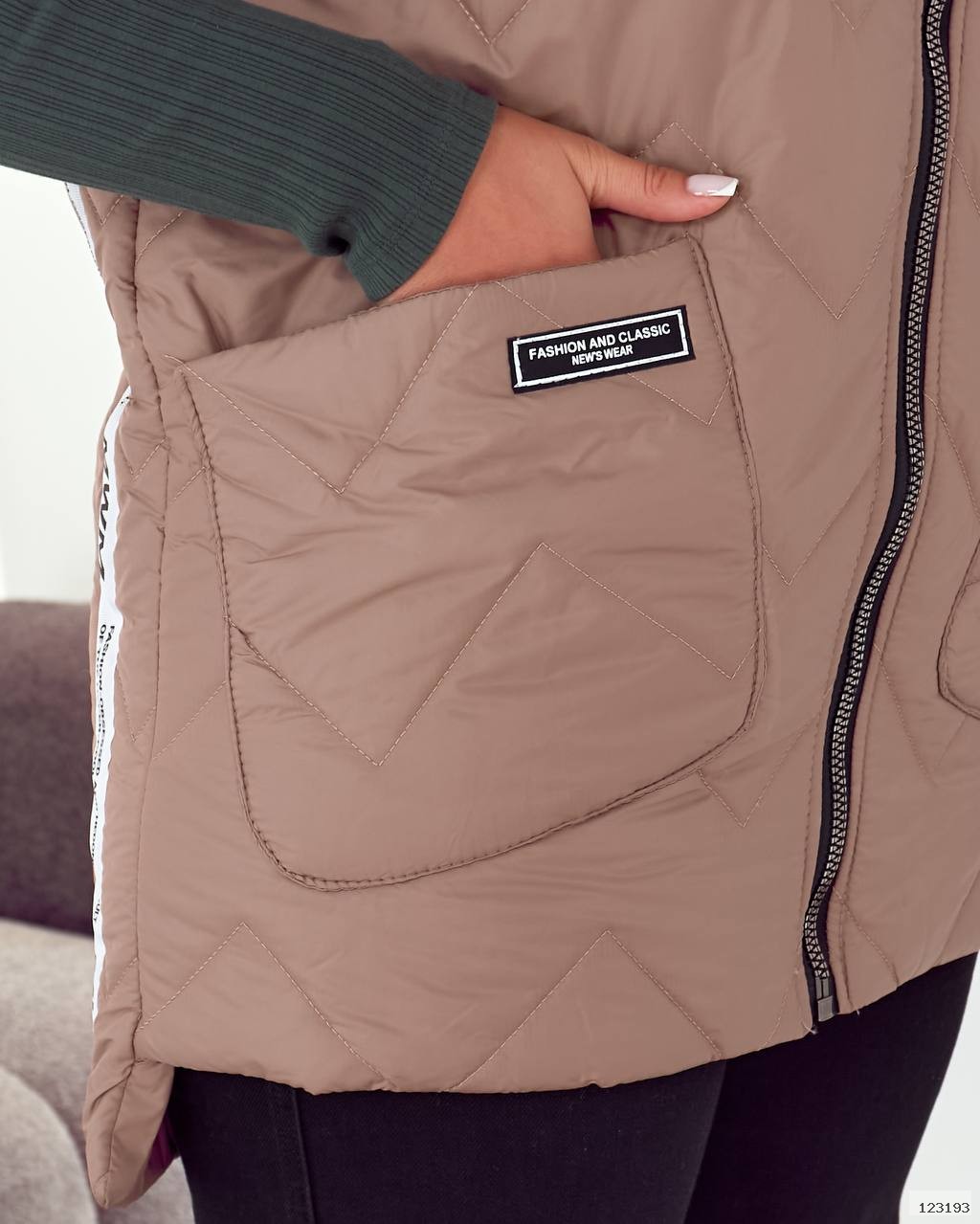 Стильна стьогана жилетка прямого крою з накладними кишенями, зручний глибокий капюшон, декорована лампасами, якісна фурнітура.