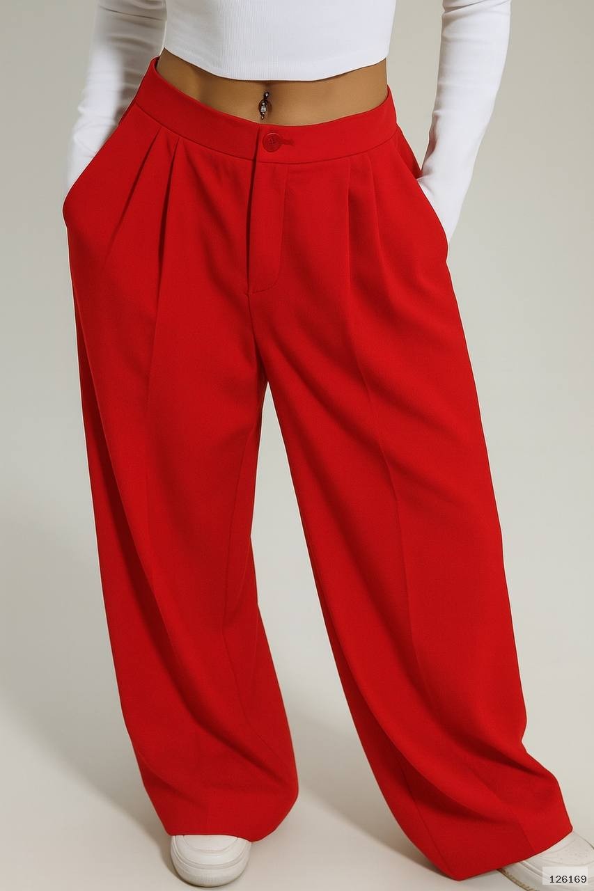 Якісна костюмна тканина, широкий крій подовжує силует, висока посадка підкреслює талію. Тканина не мнеться й чудово тримає форму.