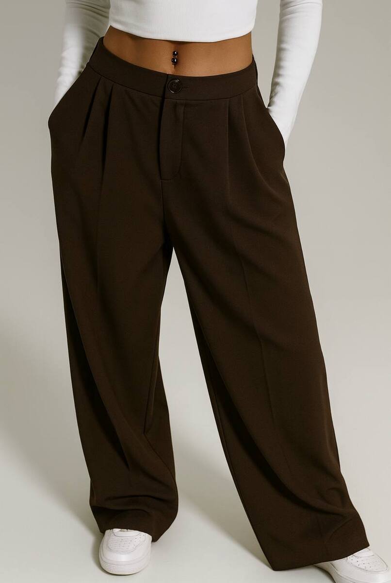 Якісна костюмна тканина, широкий крій подовжує силует, висока посадка підкреслює талію. Тканина не мнеться й чудово тримає форму.