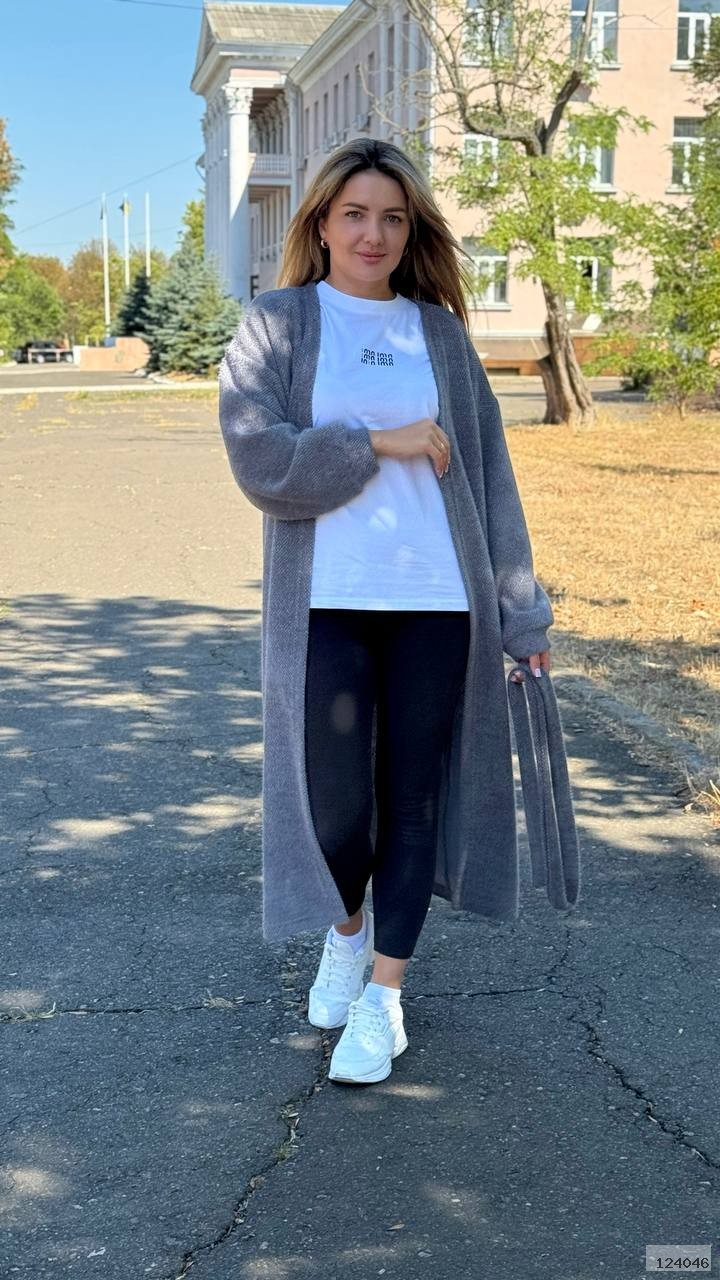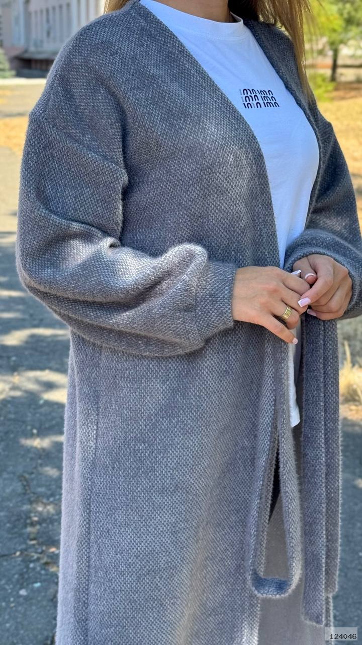 Кардиган подовжений, рукав широкий, плече спущене, пояс йде окремо, не пришитий, тканина тягнеться