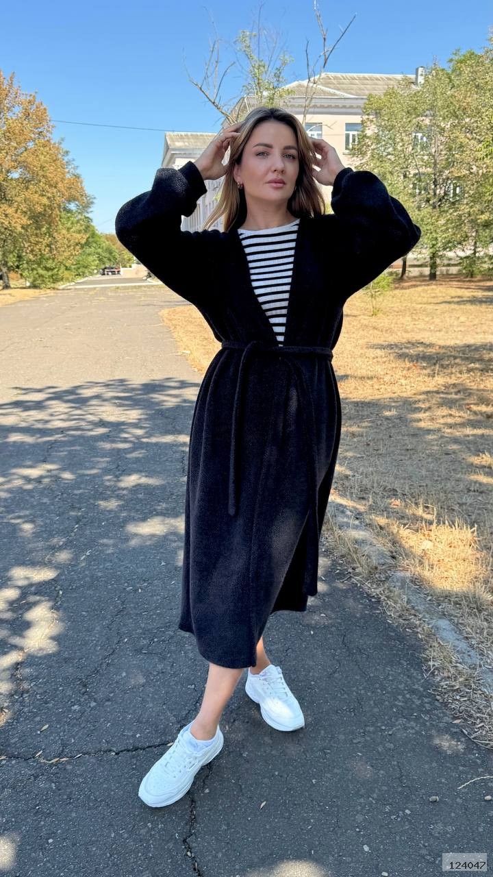 Кардиган подовжений, рукав широкий, плече спущене, пояс йде окремо, не пришитий, тканина тягнеться