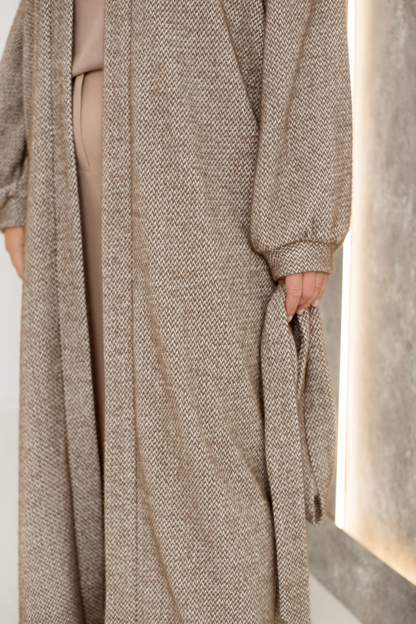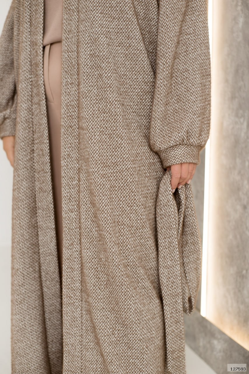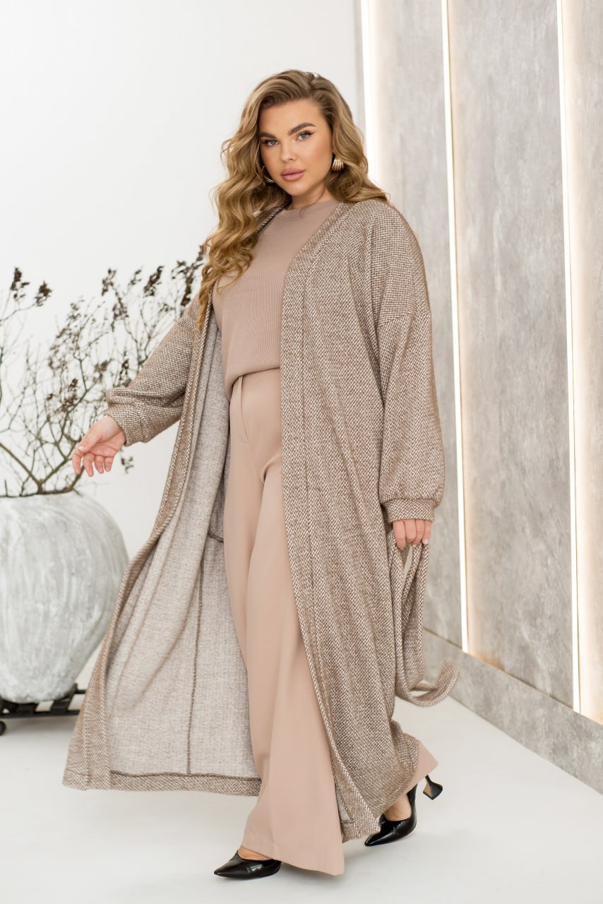 Довгий кардиган, створений із надзвичайно м’якої та приємної на дотик тканини, подарує вам комфорт і стиль у прохолодні дні. Зручні вшиті кишені з обох боків стануть практичним доповненням, а пояс у комплекті дозволяє легко підкреслити талію, створюючи елегантний силует. Цей кардиган чудово підійде для щоденних образів або розслаблених прогулянок, додаючи їм нотки тепла та витонченості.