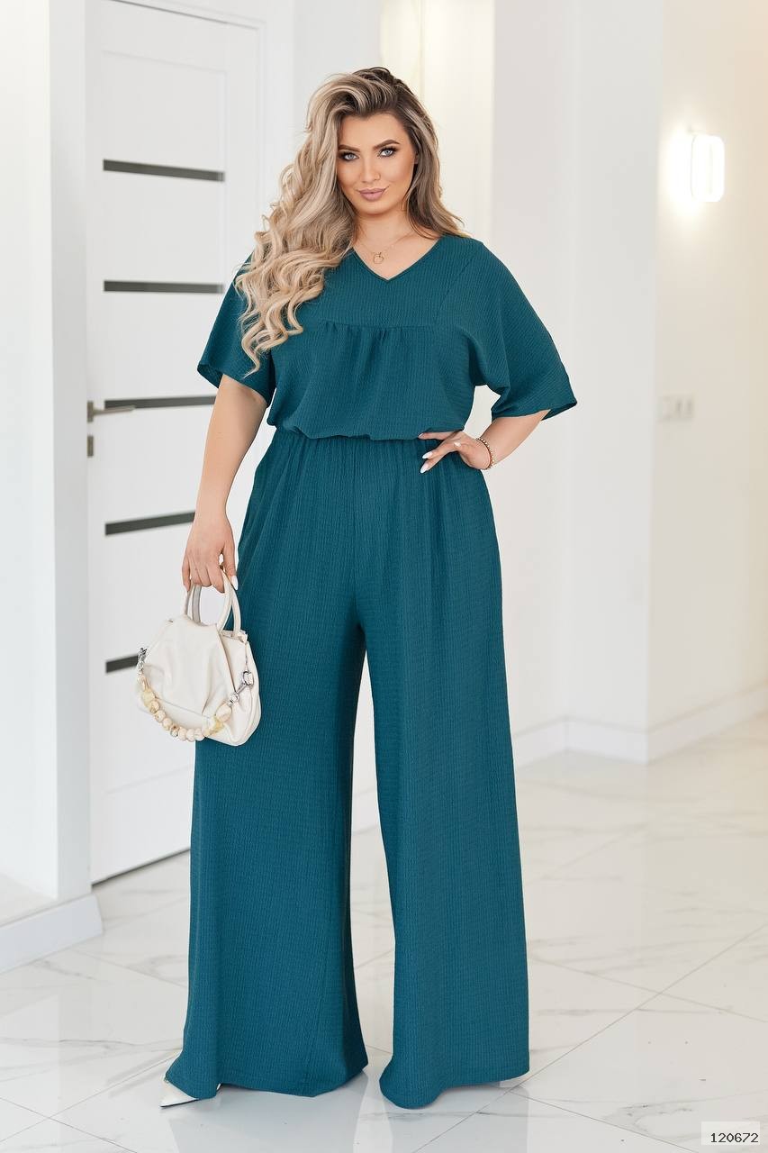 Комбінезон вільного крою, у талії на гумці , спереду і ззаду цікавий V-подібний виріз, позаду фіксується зав'язками. Штани палаццо з високою посадкою, з кишенями. Одягати через верх, горловина досить широка.