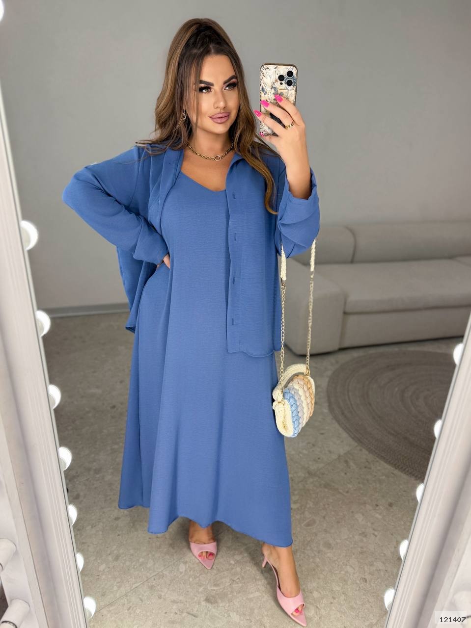 Сорочка на ґудзиках, рукав регулюється прихованим патіком на ґудзику, варіант довгий та укорочений рукав. Сарафан на брителях з регуляторами.