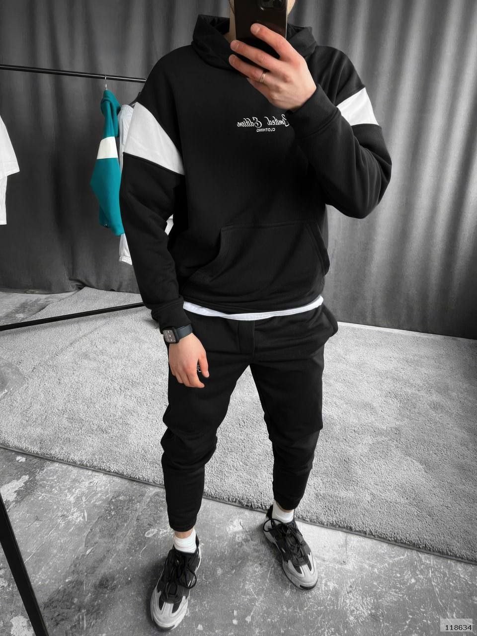 Худі має кишеню-кенгуру,капюшон і резинку з фіксаторами по низу,а штани — еластичний пояс зі шнурком,бічні кишені і манжети на резинці.