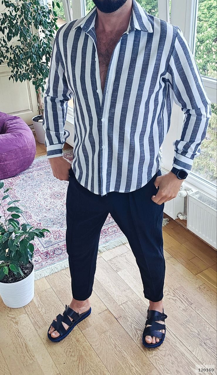 Комфортна сорочка класичного крою з коміром-стійкою та довгими рукавами з манжетами на ґудзиках. Штани на резинці зі шнурком і бічними кишенями-зручні та легкі.