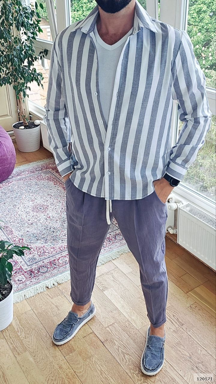 Комфортна сорочка класичного крою з коміром-стійкою та довгими рукавами з манжетами на ґудзиках. Штани на резинці зі шнурком і бічними кишенями-зручні та легкі.