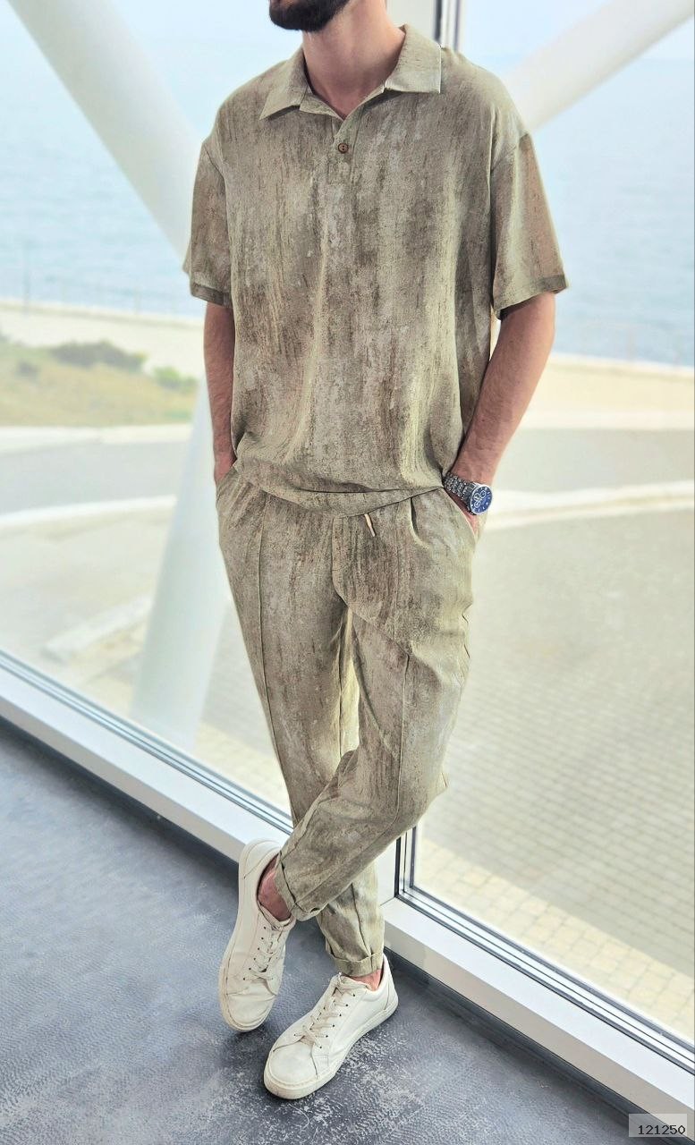 Футболка з коротким рукавом,коміром-поло та гудзиком,штани на резинці з бічними кишенями.