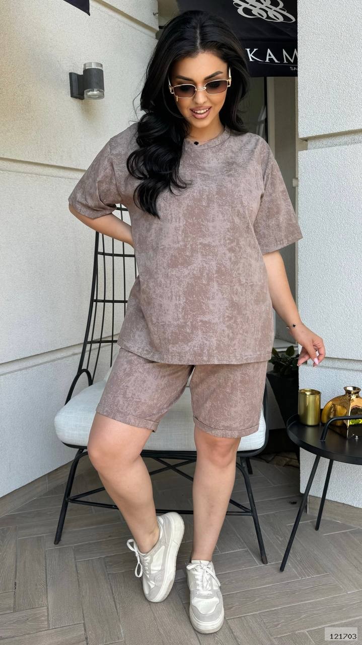 Комфортний прогулянковий костюм шорти та футболка. Шорти мають дві кишені та оздоблені манжетом, пояс на резинцi, зі шнурком .