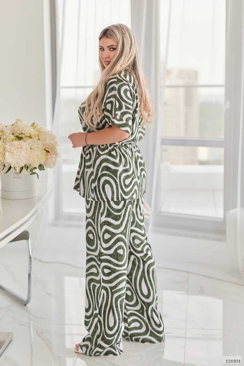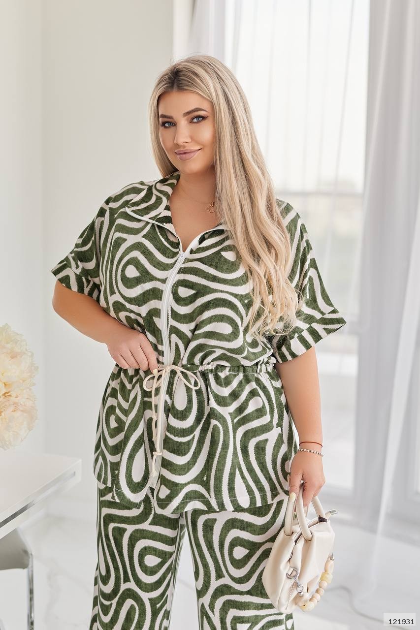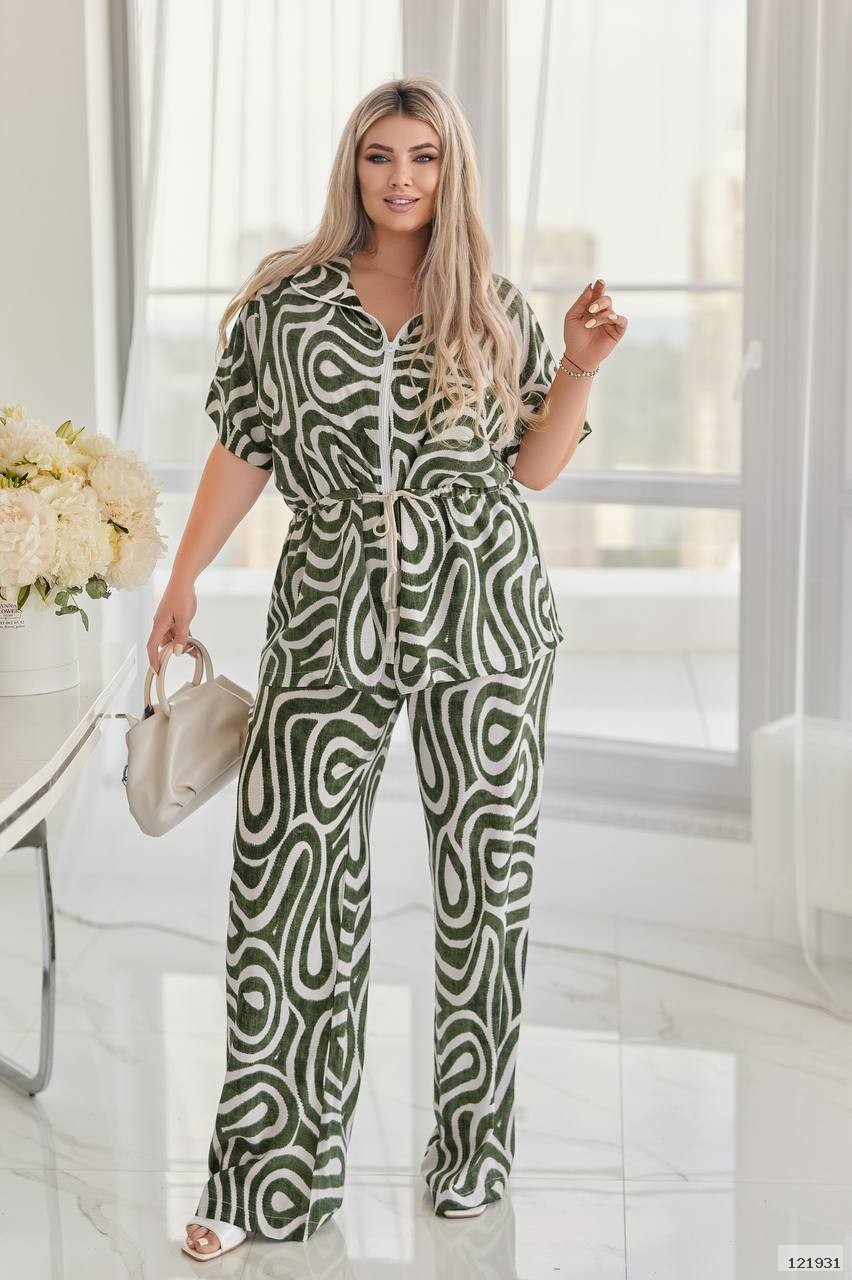 Літній брючний костюм з гарним принтом і благородним поєднанням кольорів ідеально підійде на літню спекотну погоду, як для повсякденного носіння, так і для урочистостей. Блуза «оверсайз» вільного силуету на змійці, на талії затягується на куліску