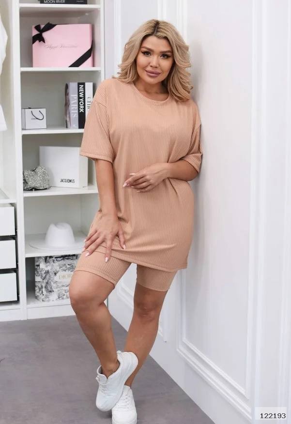 Стильний костюм двійка.Футболка оверсайз та велосипедки.Висока посадка веліків робить їх мега зручними.Футболка вільного крою дуже зручна та комфортна.