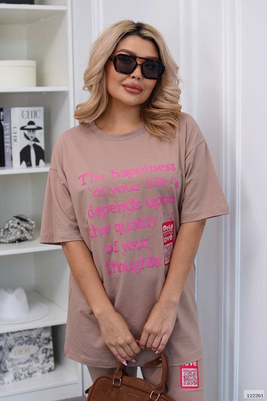 Стильний костюм двійка.Футболка оверсайз та велосипедки з якісним накатом.Висока посадка веліків робить їх мега зручними.Футболка вільного крою дуже зручна та комфортна.