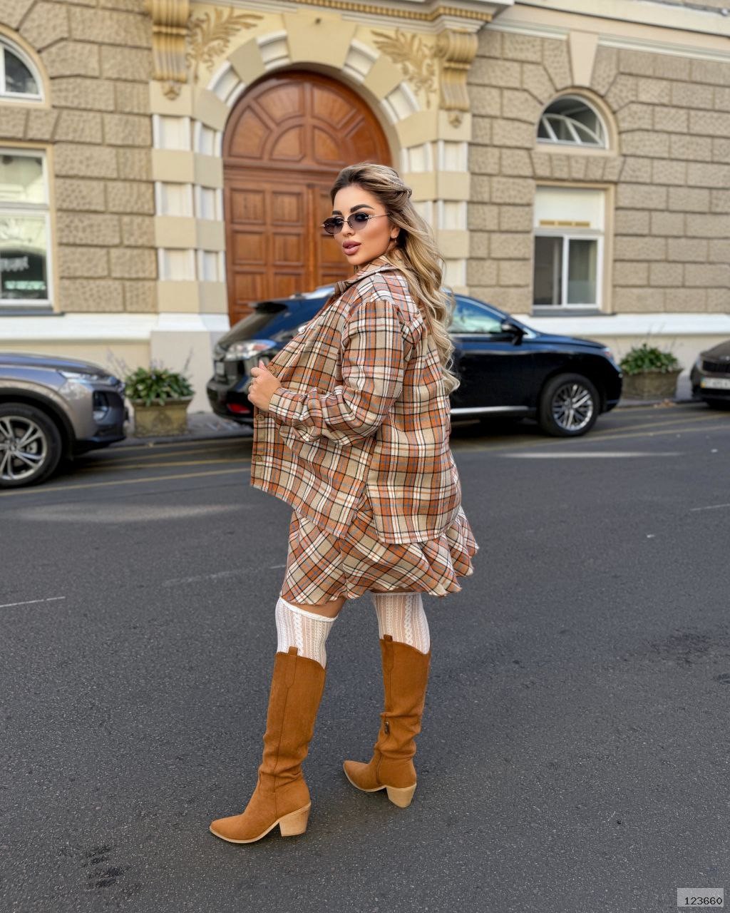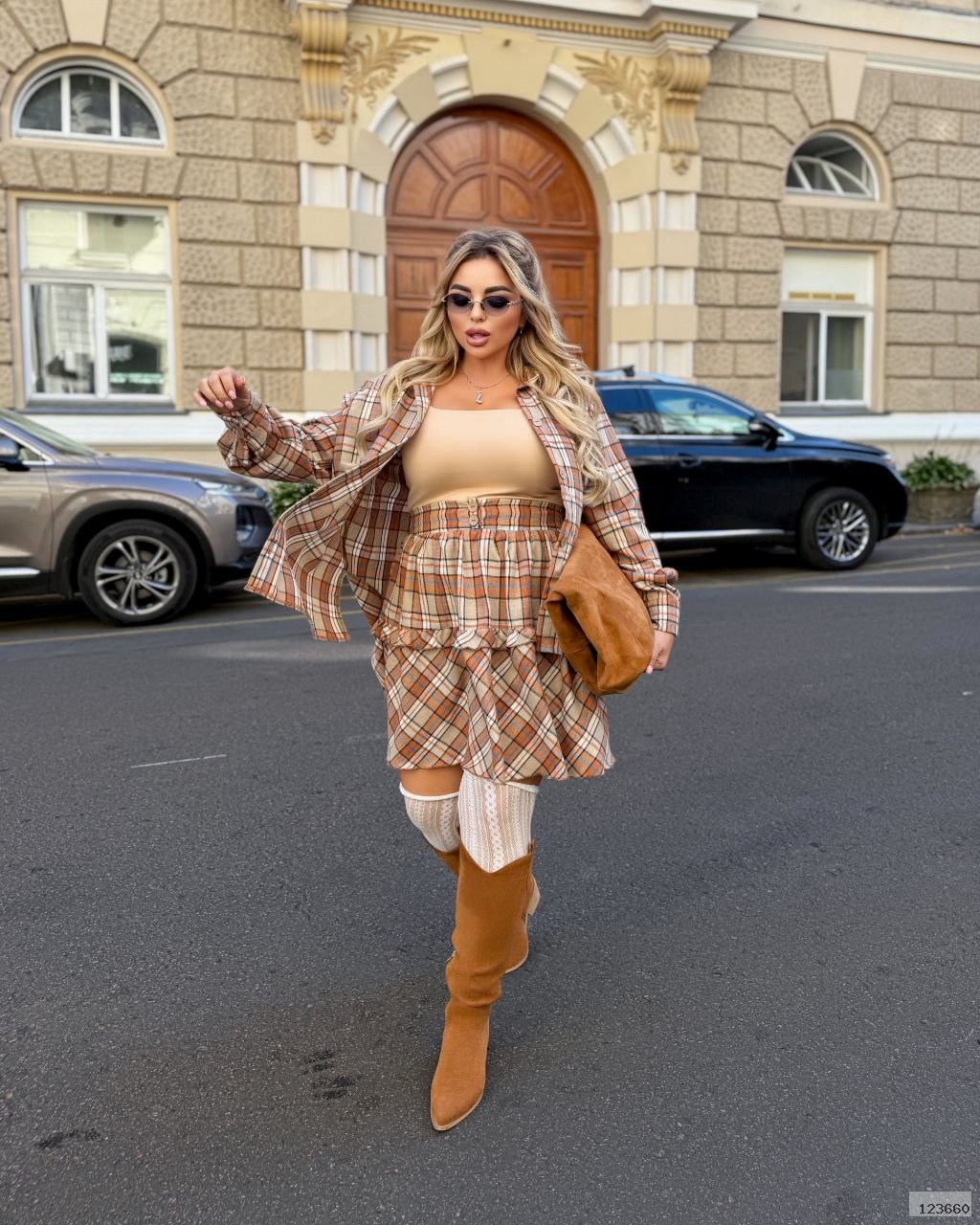 Стильний та комфортний костюм, що складається з фланелевої сорочки та спідниці. Ідеальний варіант для прохолодної пори року. М'яка фланель приємна до тіла, забезпечує тепло та затишок.