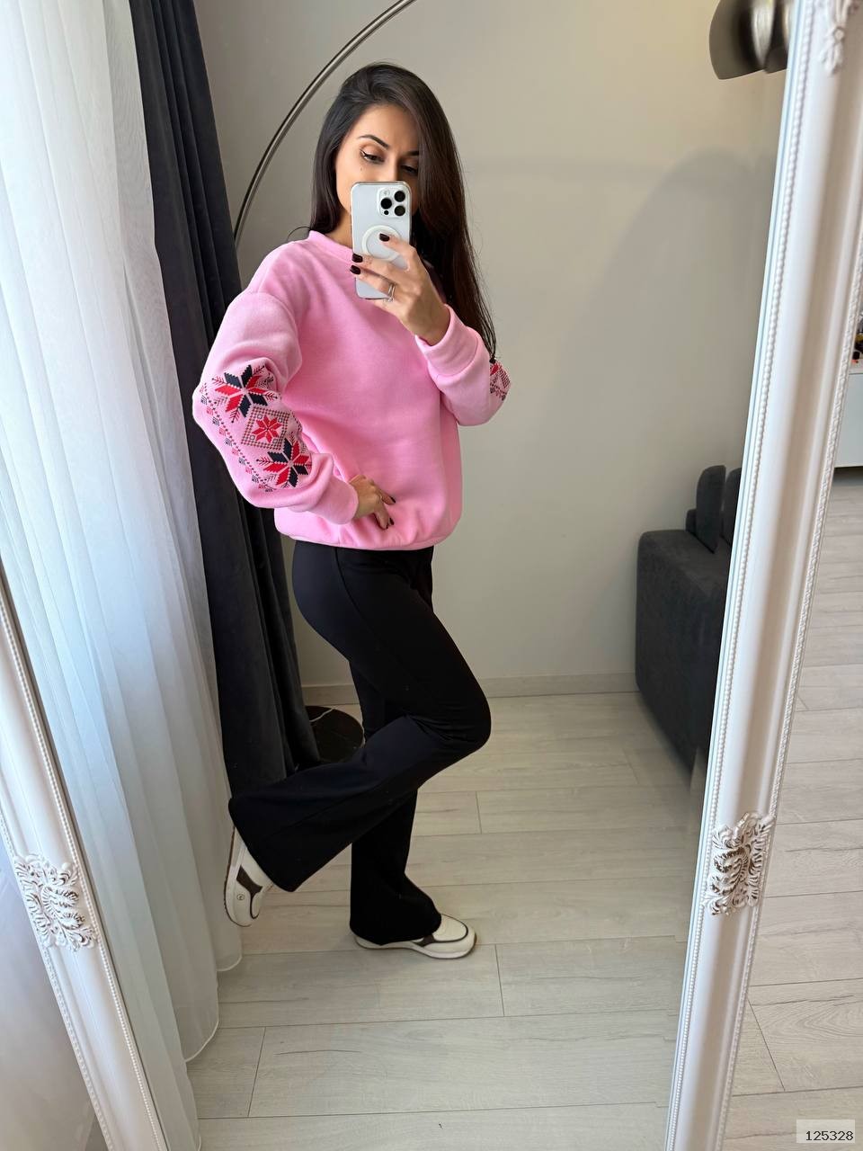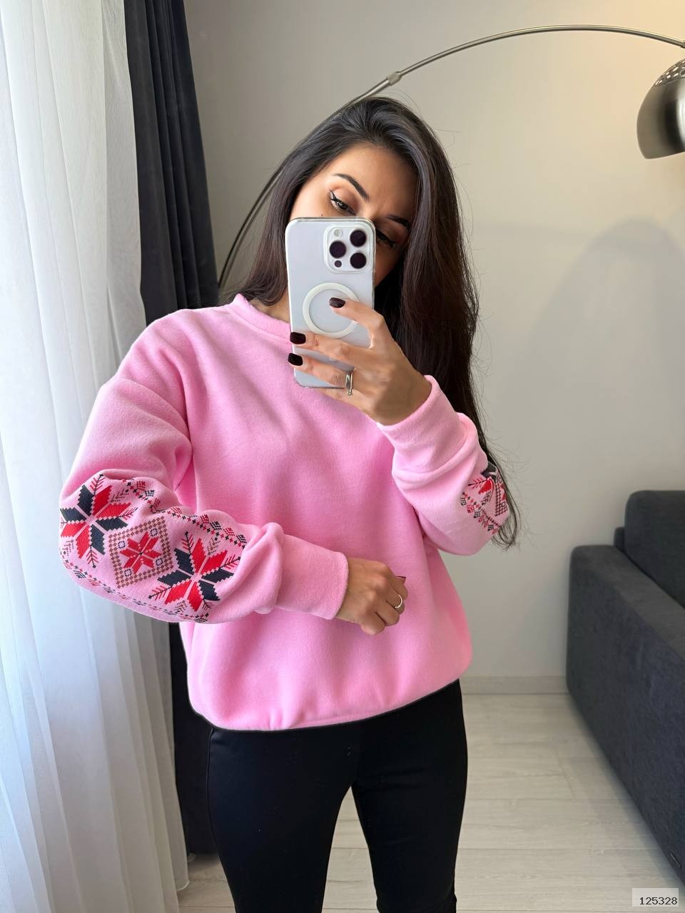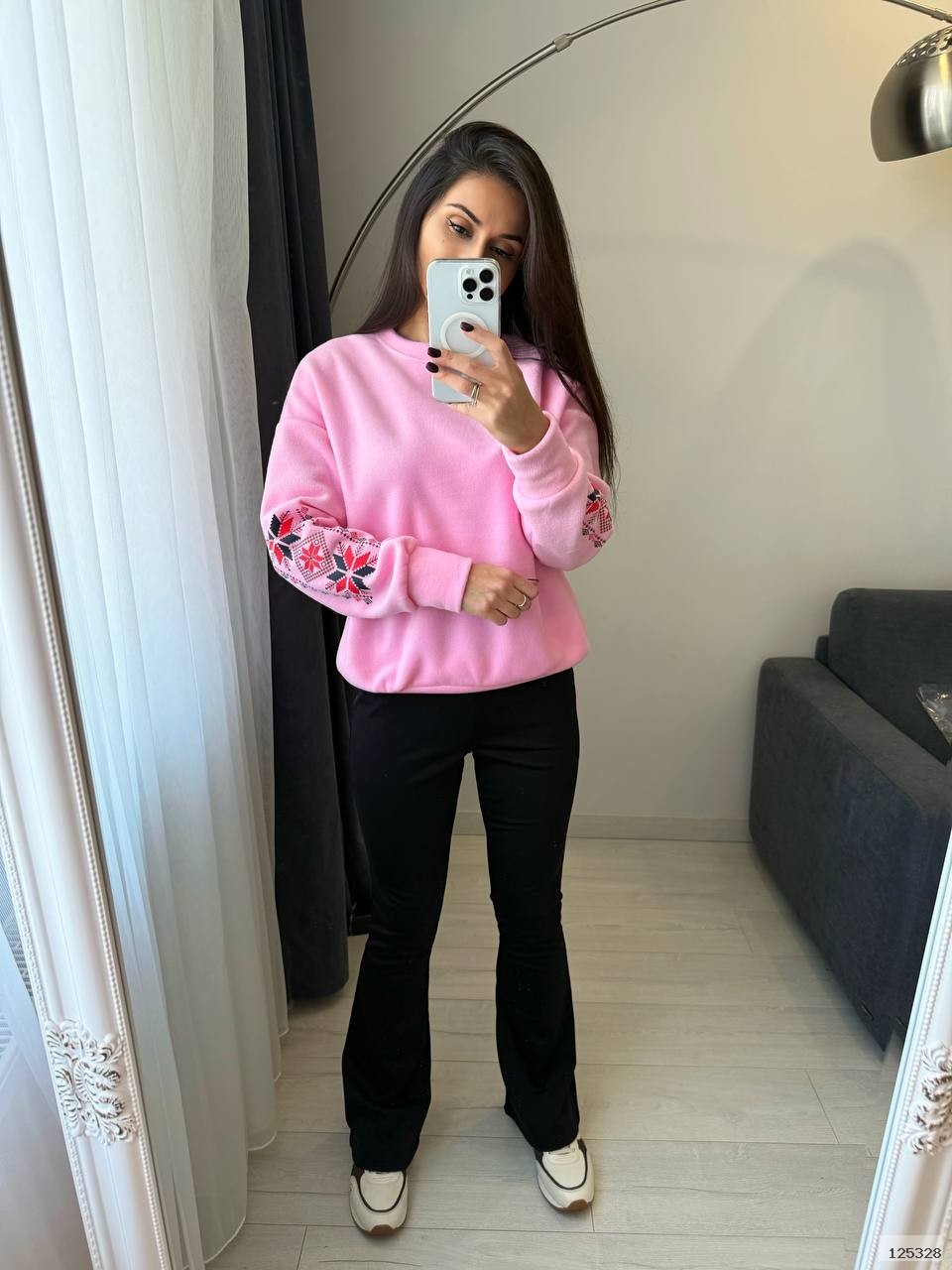 Костюм (кофта+лосини теплі). М’який трикотаж із начосом дарує затишок і тепло, а продуманий крій забезпечує зручність у кожному русі. Кофта з оригінальною вишивкою на рукаві додає образу родзинки, а лосини з високою посадкою красиво підкреслюють фігуру.
