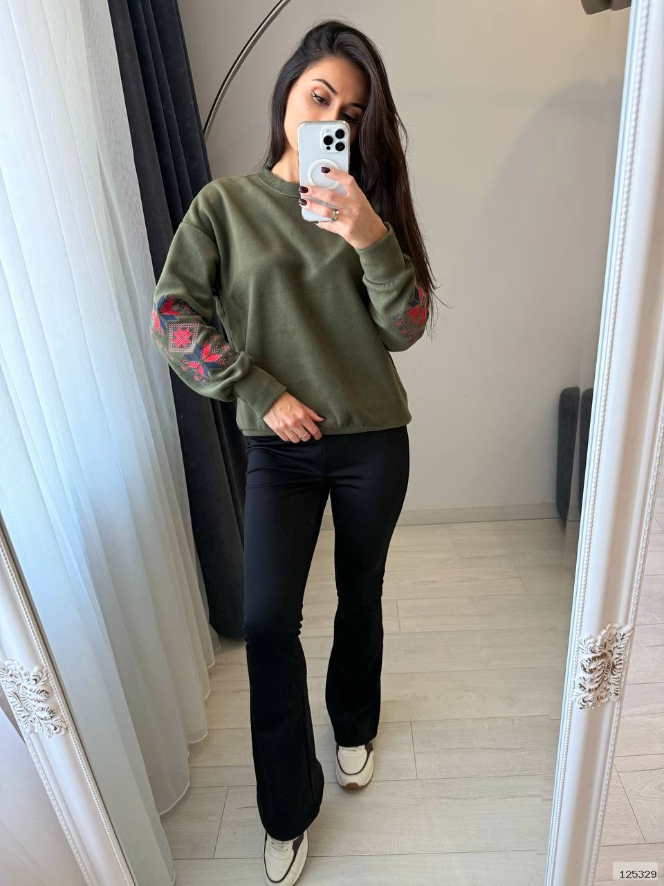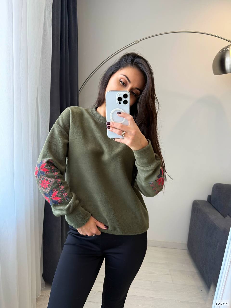 Костюм (кофта+лосини теплі). М’який трикотаж із начосом дарує затишок і тепло, а продуманий крій забезпечує зручність у кожному русі. Кофта з оригінальною вишивкою на рукаві додає образу родзинки, а лосини з високою посадкою красиво підкреслюють фігуру.