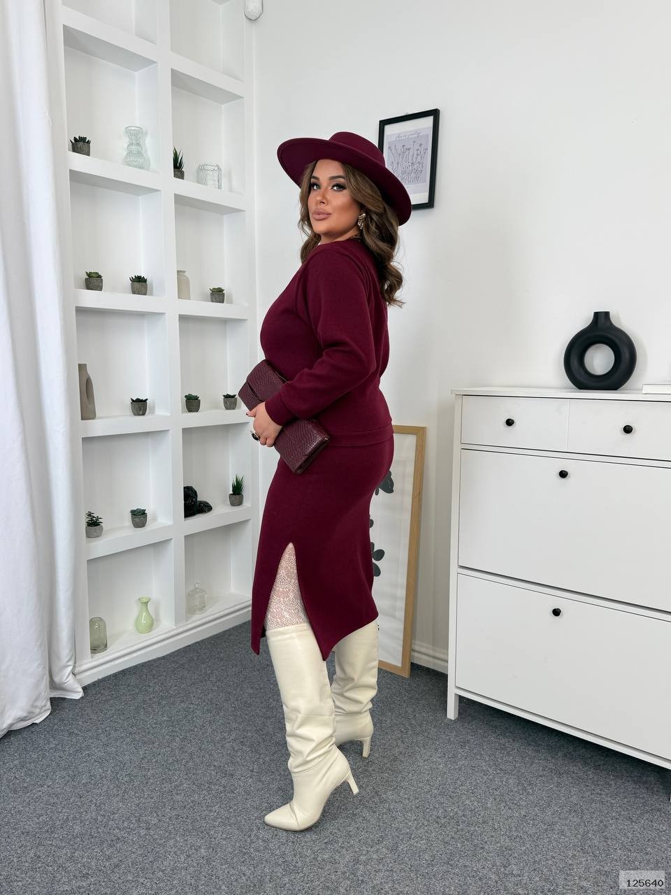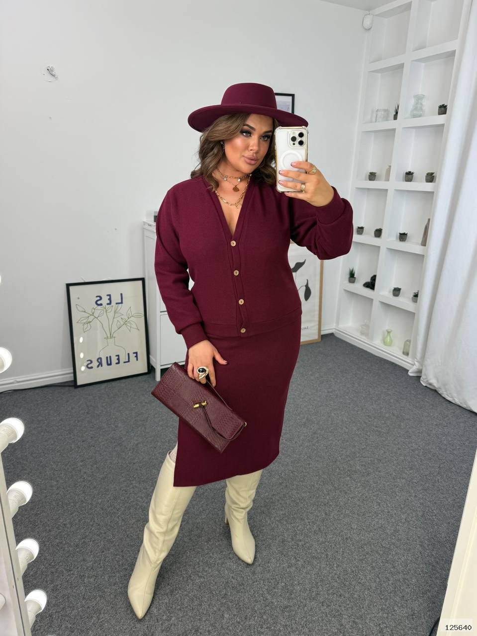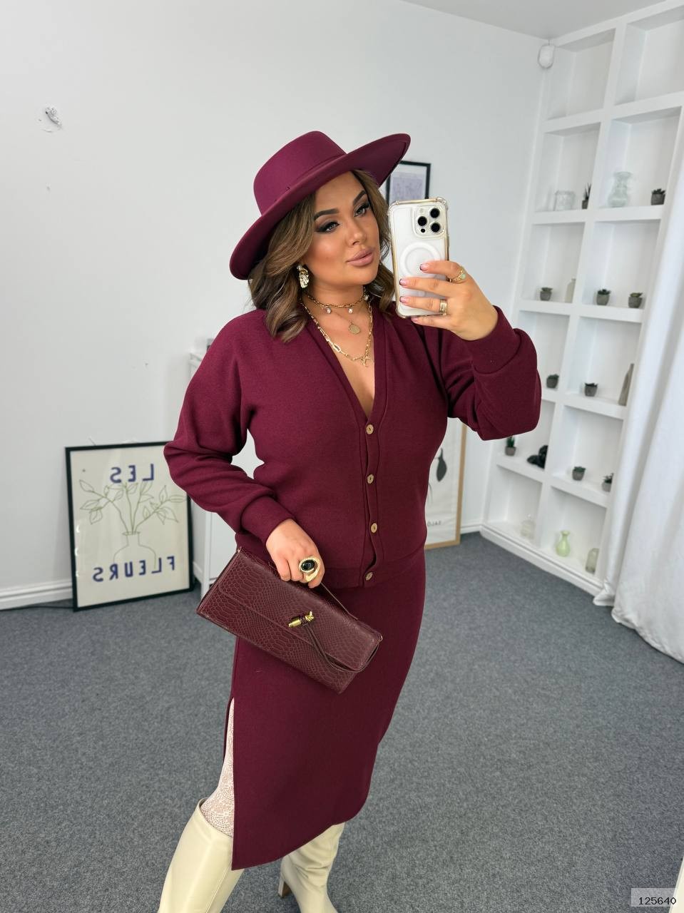 Костюм з кофти та спідниці. Кофта довгий рукав, застібається на ґудзики. Рукав манжета. Спідниця із резинкою на талії,з одного боку розріз знизу.