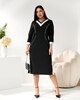 Стильна сукня, v- образний виріз витягує шию та підкреслює зону декольте. Контрастні білі лінії з боків роблять фігуру стрункішою.