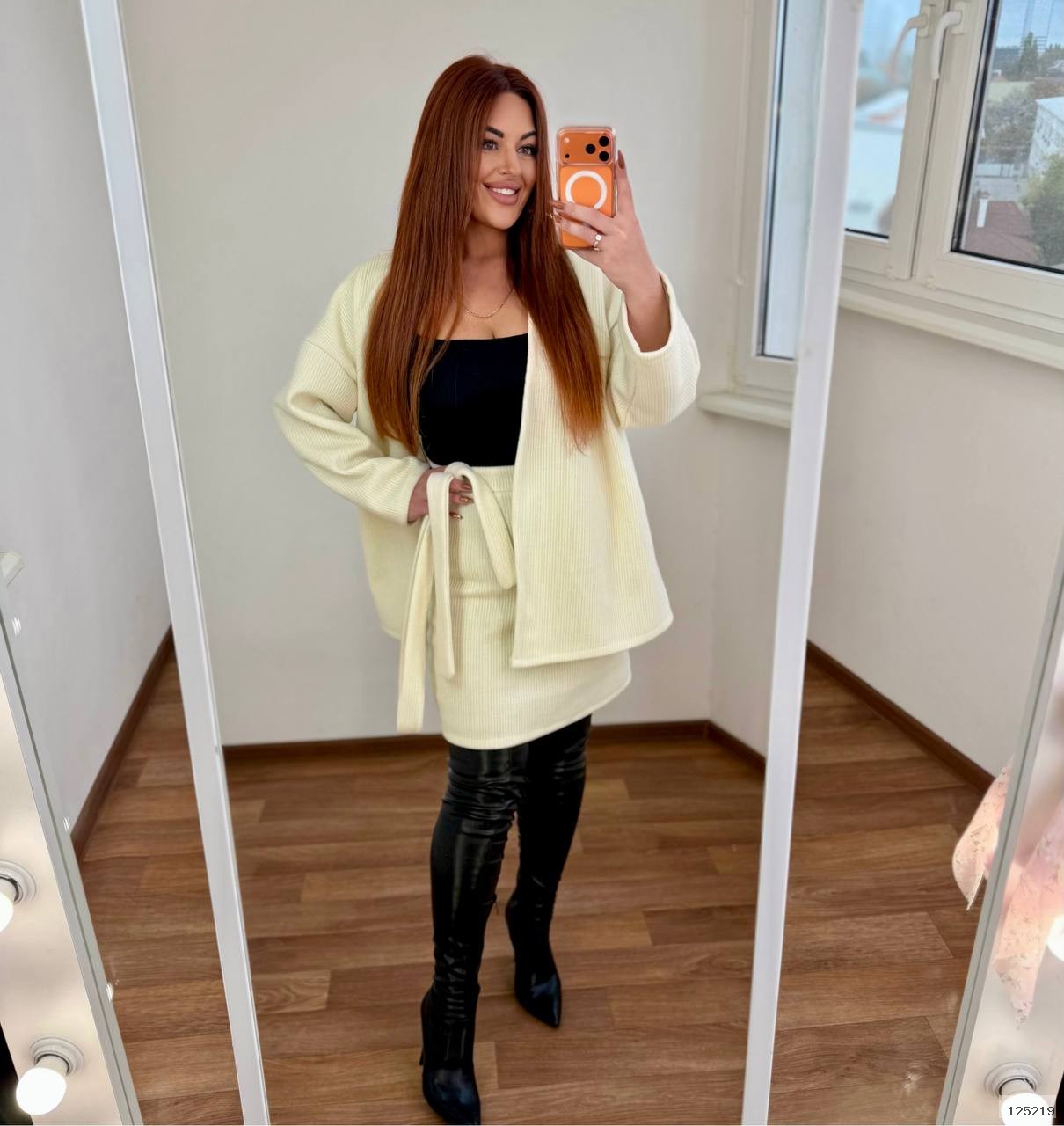 Ніжний, м’який кашемір дарує відчуття тепла та затишку, а продуманий фасон додає жіночності й вишуканості. Комплект складається зі спідниці та кардигана вільного крою, які можна носити разом або комбінувати з іншими речами гардероба.