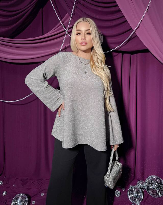 Верх — кофта , яка красиво сяє та додає образу елегантності.