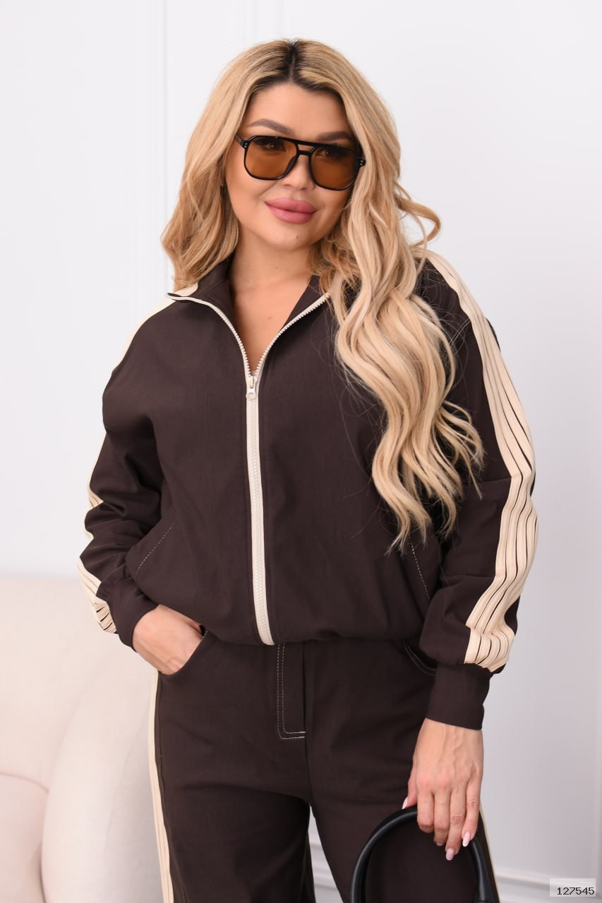 Стильний брючний костюм з еластичної тканини для тих, хто любить баланс комфорту й елегантності. Кофта та штани оздоблені лампасами: кофта на блискавці по всій довжині з прорізними кишенями та еластичним манжетом внизу. Штани середньої посадки з еластичною резинкою на поясі у стилі палаццо — витягують силует і пасують до будь-якого взуття, від кросівок до лоферів.