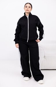 Стильний брючний костюм з еластичної тканини для тих, хто любить баланс комфорту й елегантності. Кофта та штани оздоблені лампасами: кофта на блискавці по всій довжині з прорізними кишенями та еластичним манжетом внизу. Штани середньої посадки з еластичною резинкою на поясі у стилі палаццо — витягують силует і пасують до будь-якого взуття, від кросівок до лоферів.