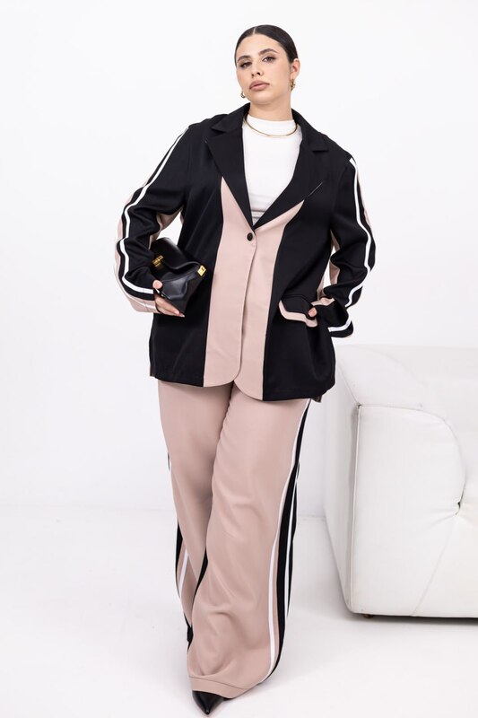 Стильний брючний костюм із костюмної тканини. Комбіновані кольори, лампаси та легкий оверсайз роблять образ сучасним і виразним. Ідеальний для міських прогулянок, подорожей і смарт-кежуал виходів. Піджак застібається на кнопку з прорізними кишенями-клапанами; вільні штани середньої посадки з еластичною резинкою на поясі — комфорт щодня без компромісів.