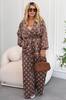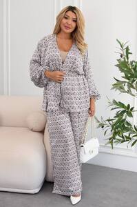 Верх має V-подібний виріз і фіксується на талії за допомогою куліски, що дозволяє регулювати об’єм і красиво підкреслює силует. Рукави об’ємні, з м’якими зборами на манжетах, додають легкості образу. Штани — широкі, вільного крою, що забезпечує комфорт і свободу рухів.