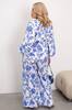 Верх має V-подібний виріз і фіксується на талії за допомогою куліски, що дозволяє регулювати об’єм і красиво підкреслює силует. Рукави об’ємні, з м’якими зборами на манжетах, додають легкості образу. Штани — широкі, вільного крою, що забезпечує комфорт і свободу рухів.
