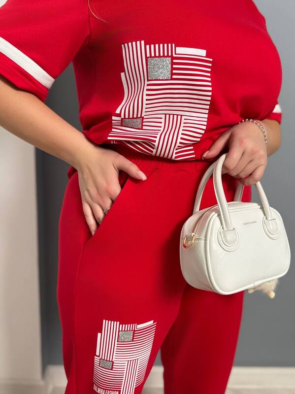 Костюм -двійка , прикрашений на кофта та штанах накатами та кіперною стрічкою. Кофта вільного крою , рукав прикриває лікоть , штани -кльош , з боків кишені , талія на широкій резинці