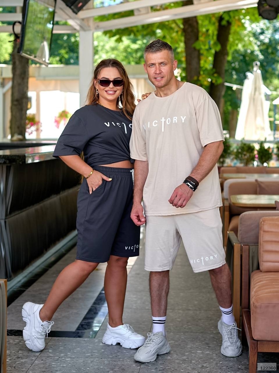 Футболка вільного крою з округлим вирізом + шорти на резинці зі шнурком і боковими кишенями.Доповнені стильною наклейкою «Victory».