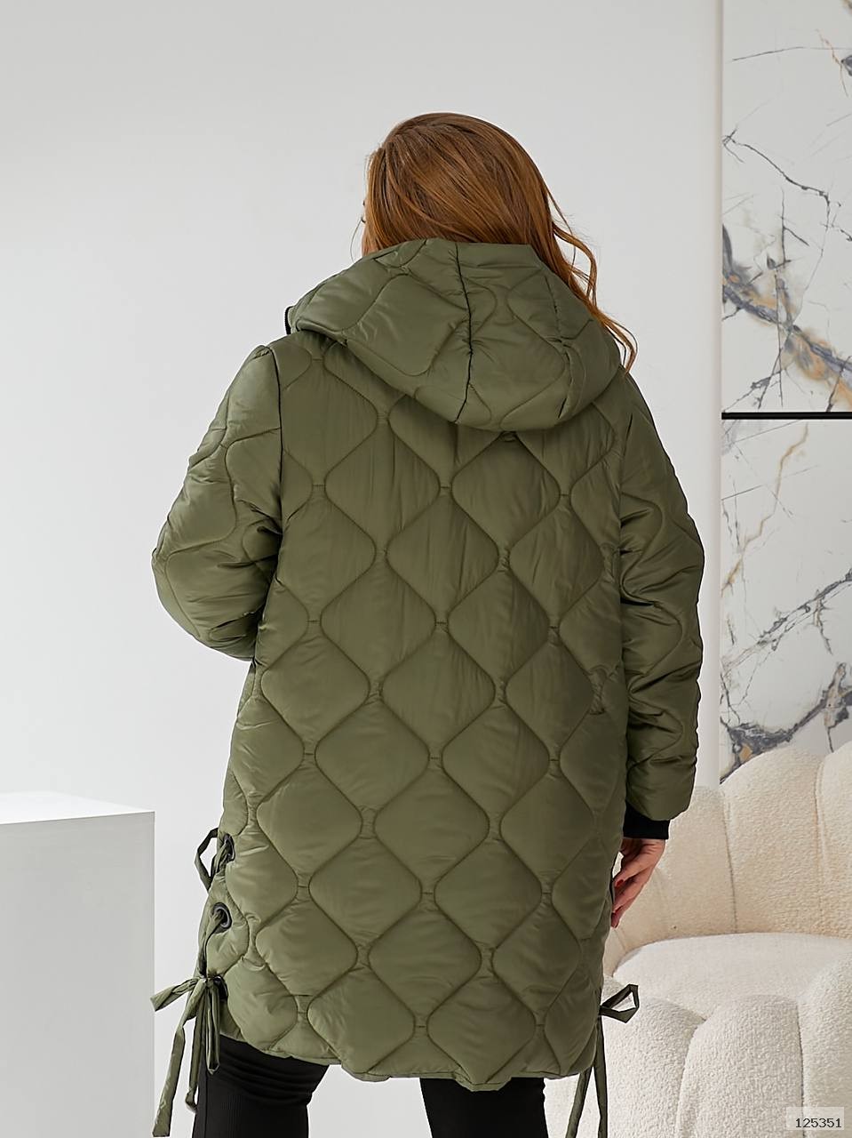 Стильна стьобана куртка цікавого крою із зав'язками з боків, глибокий зручний капюшон, кишені, манжети.