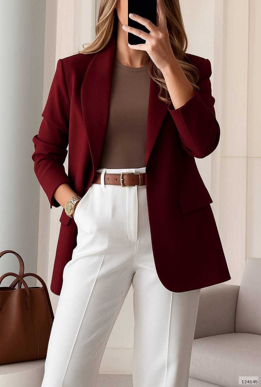 Тканина: костюмна тканина – щільна, м’яка та тримає форму. Піджак має підкладку та підплечники.