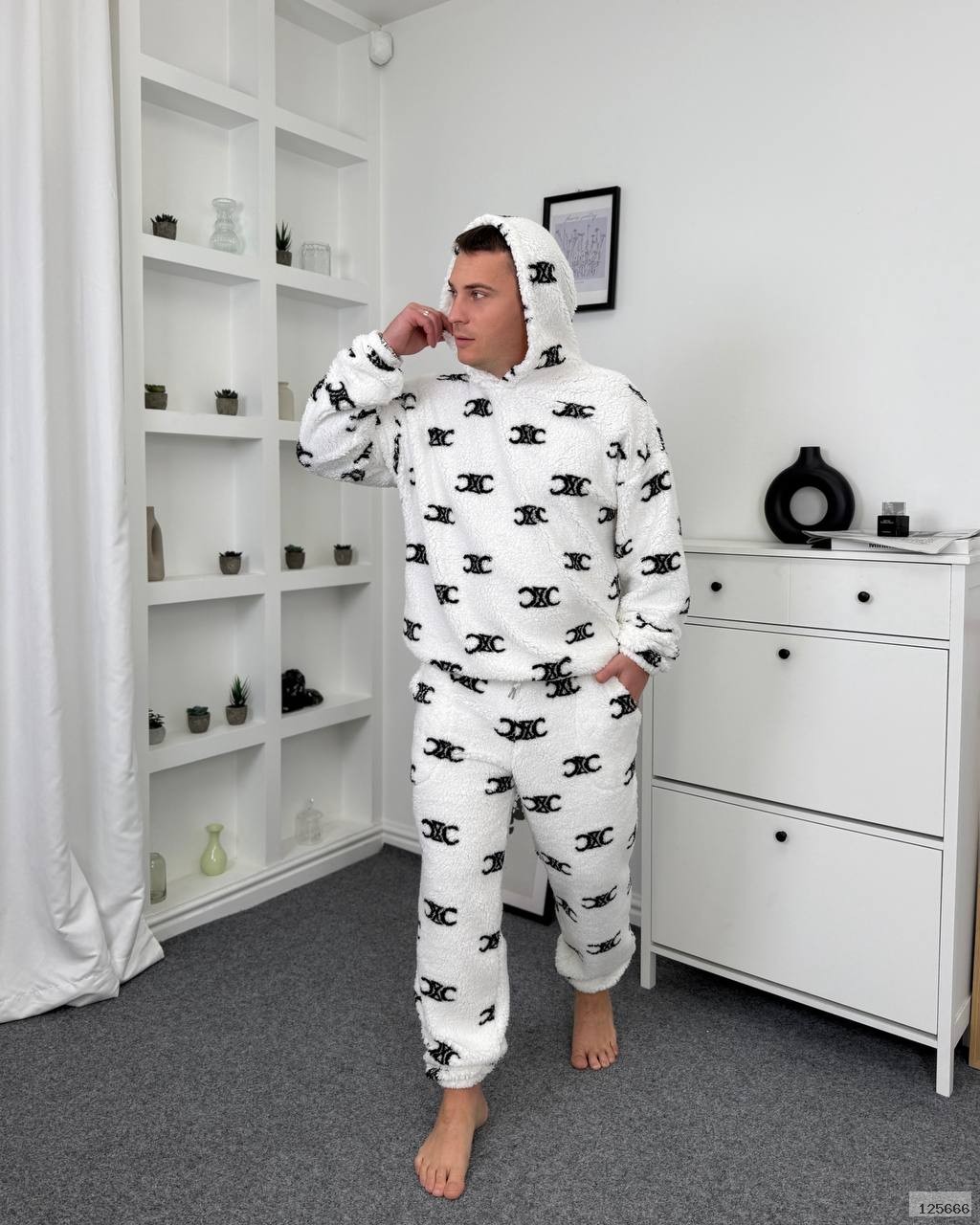 Затишна піжама,що складається з худі з капюшоном та штанів з еластичним поясом і шнурком.