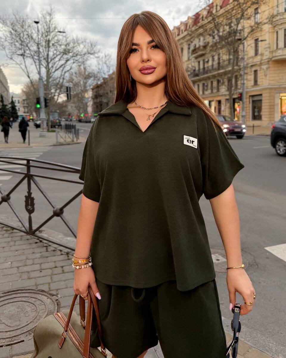 Стильний комфортний костюм з шортами з трикотажу еластан : футболка поло у стилі оверсайз з акс + шорти з високою посадкою з кішенями у бічних швах, з куліскою на поясі