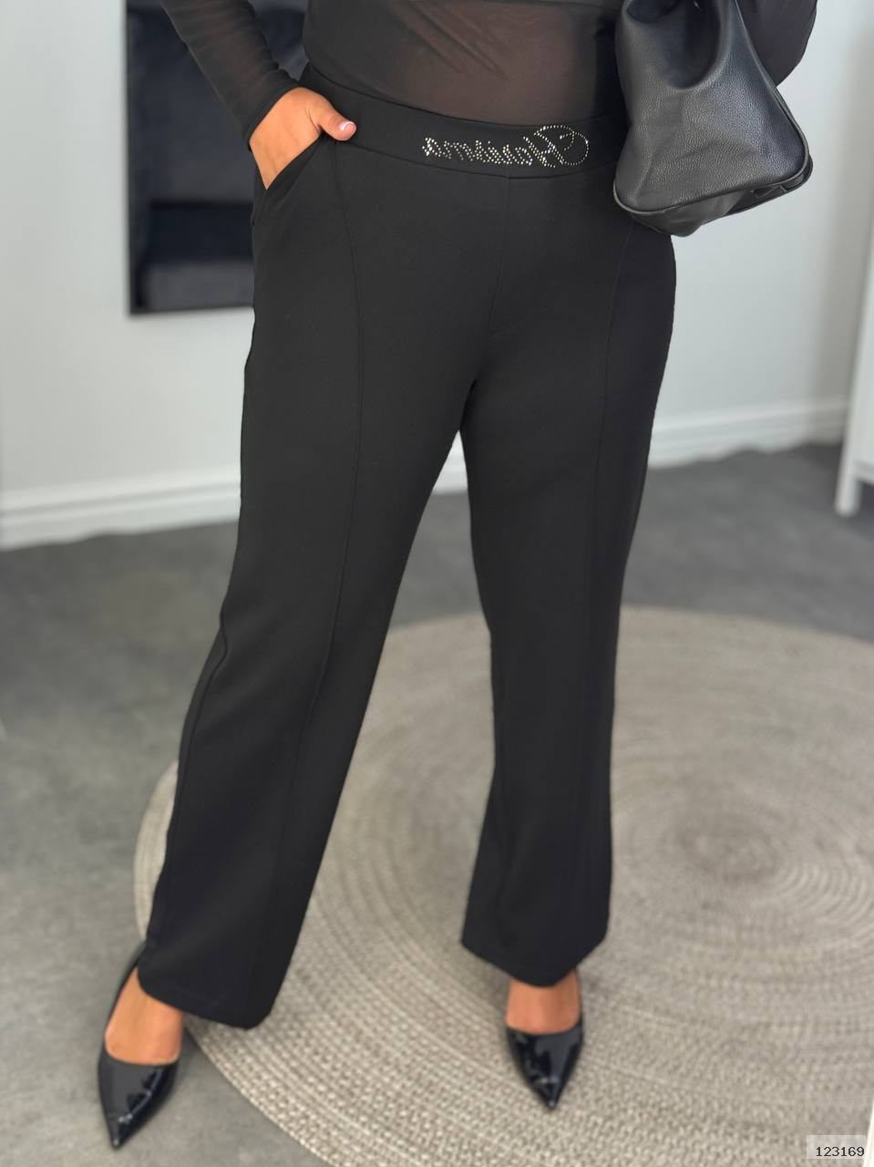 Штани прямого крою з дуже якісного трикотажу. Тканина добре тягнеться та добре тримає форму. Штани високої посадки, талія на резинці, з кишенями. Пояс оздоблений термокамінням.