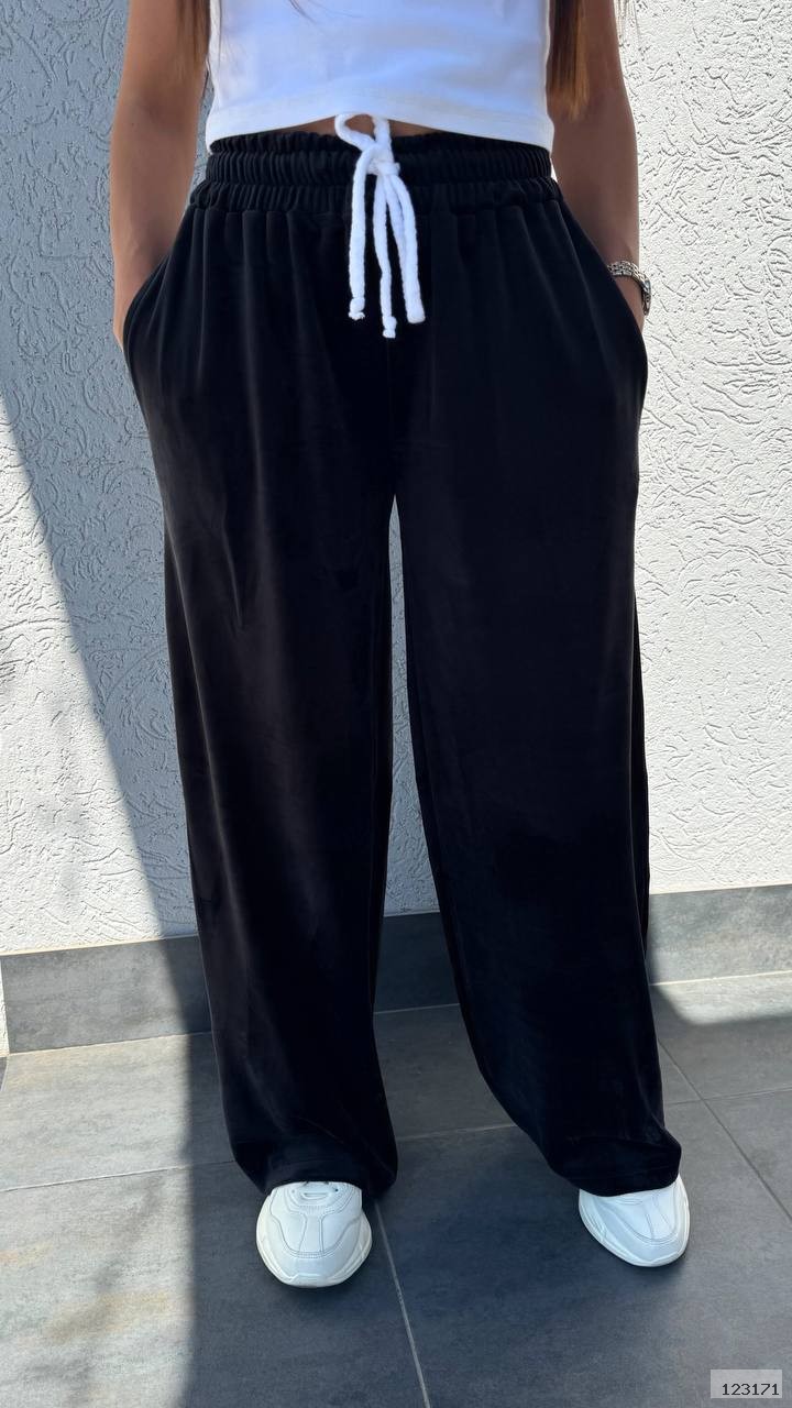 Штани вільного крою, талія на резинці, з двома карманами, позаду карман декоративний
