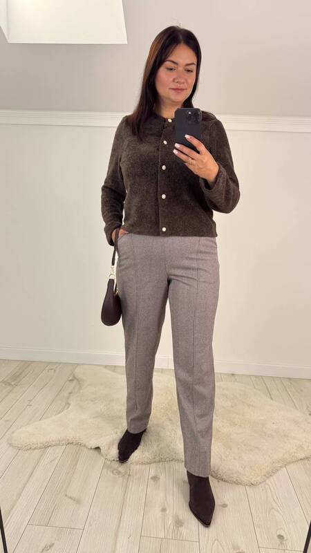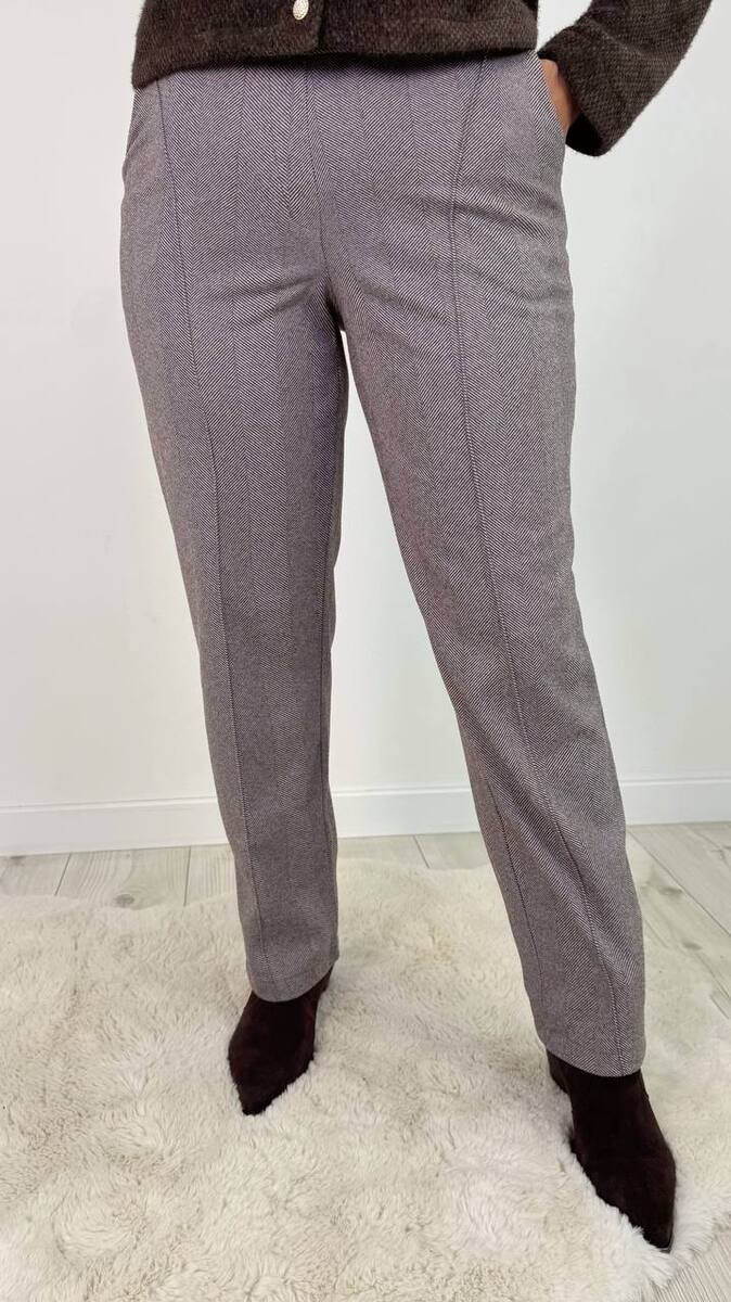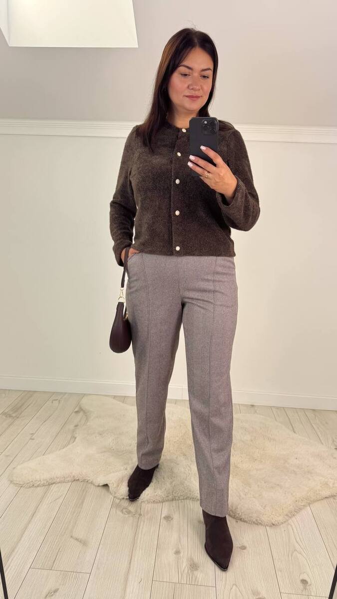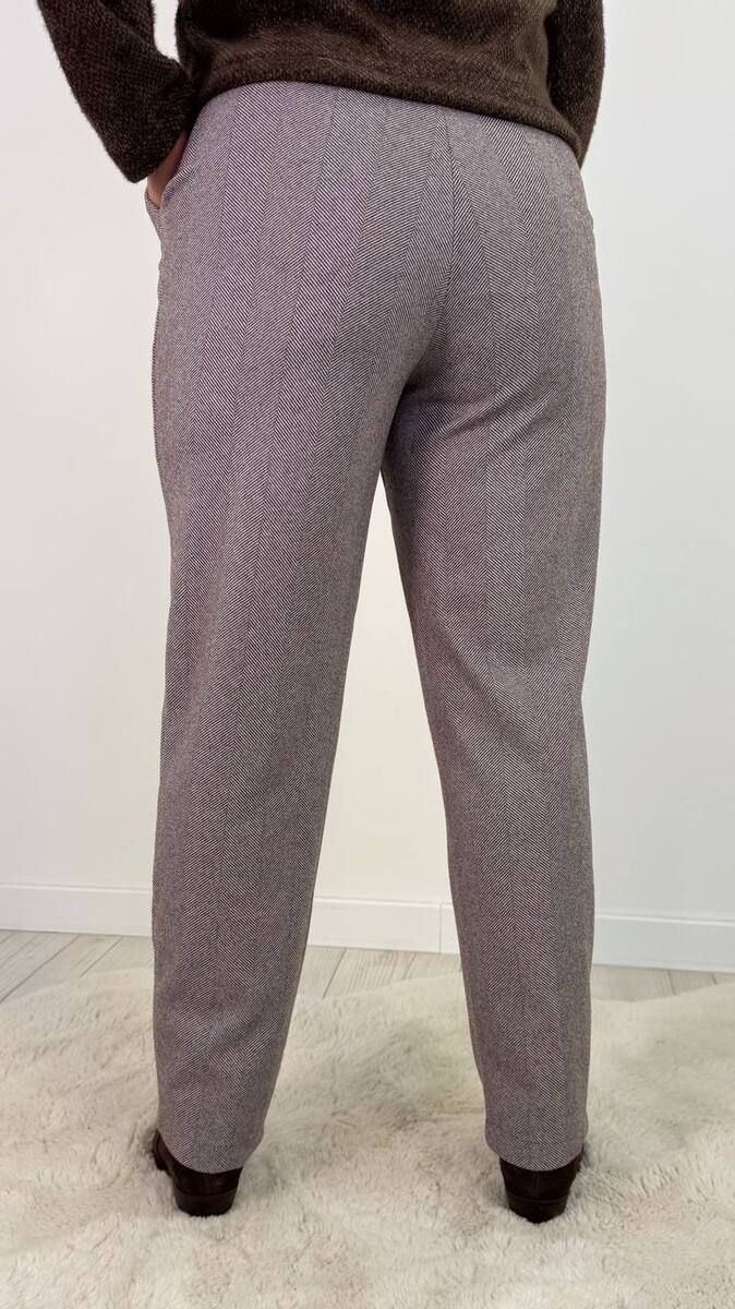 Штани посадка висока, талія на резинці, з двома карманами, штани йдуть прямого крою, до низу трошки завужені. Тканина тягнеться, тепла, мʼягка, не колеться