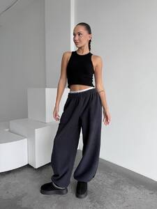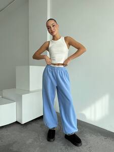 Стильні та комфортні штани вільного крою. Виготовлені з м’якої тканини, мають еластичний пояс на резинці, що забезпечує зручну посадку. Штани прямі, довжиною до підлоги, створюють легкий та розслаблений силует.