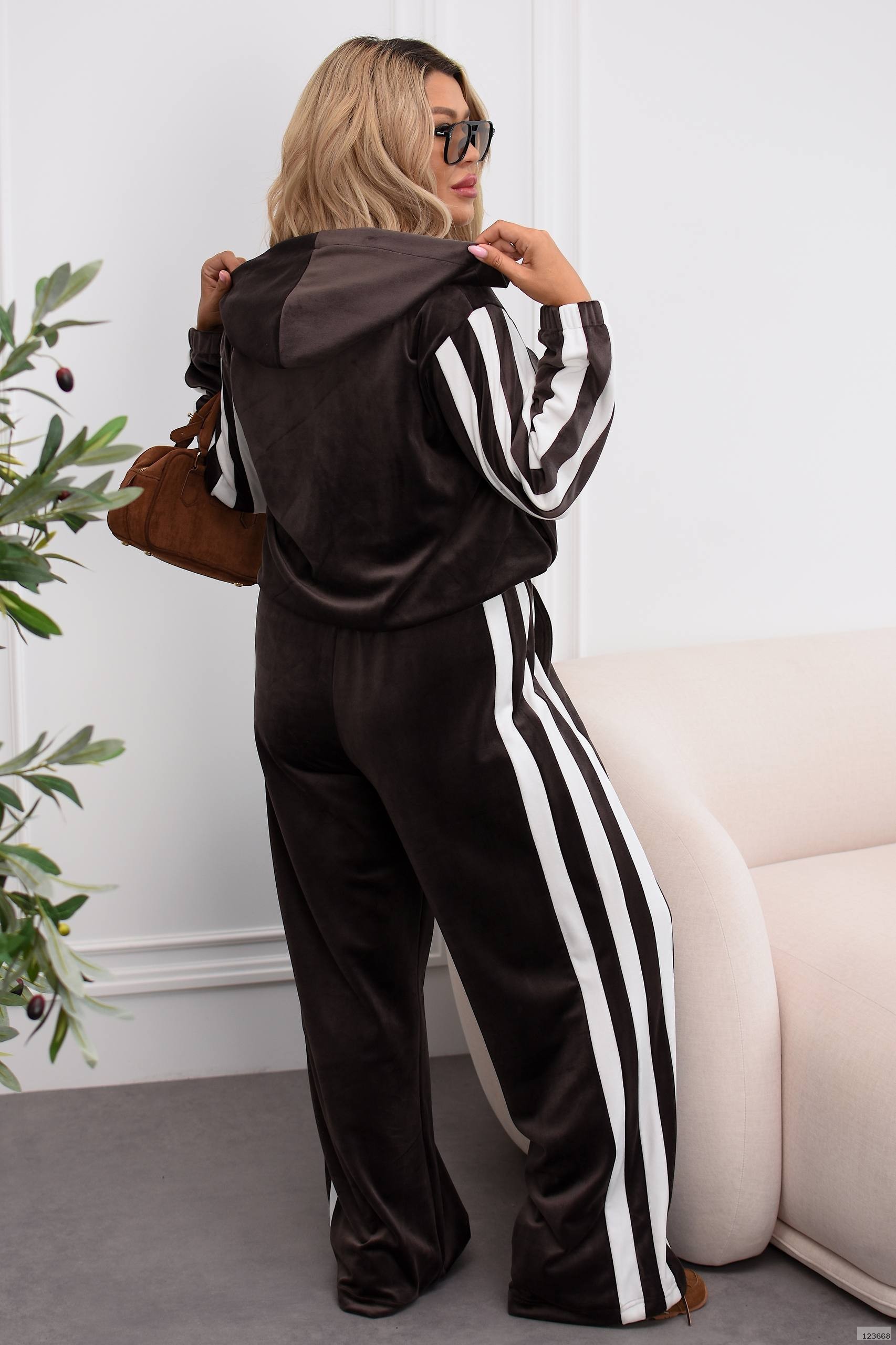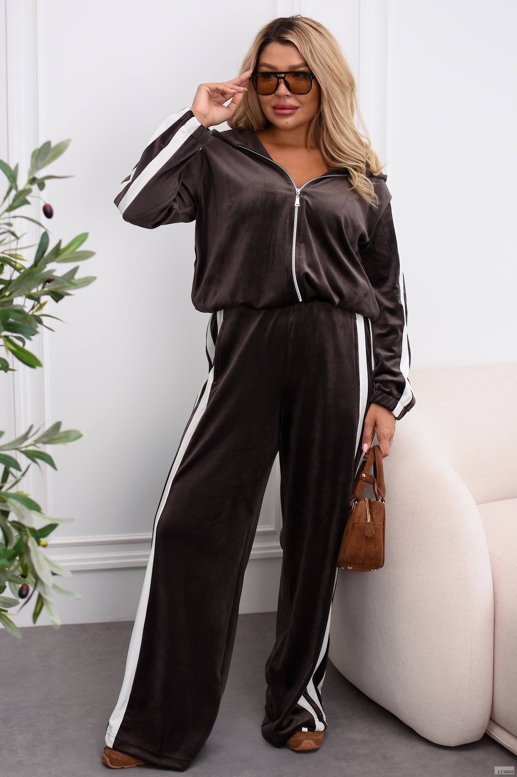 Модний та зручний комплект із м’якого велюру. Складається з кофти на блискавці з капюшоном та широких брюк палацо із високою талією . Є кишені для зручності і в кофті ,і в штанах.Костюм прикрашений контрастними білими смугами вздовж рукавів і штанів, що додає образу динамічності та візуально подовжує силует