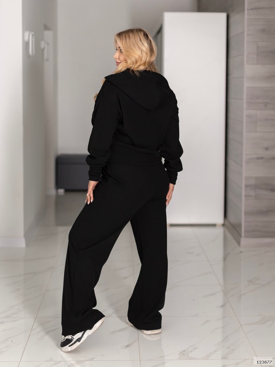 Кофта - на застібці, з капюшоном. Брюки - кльош, висока посадка, в поясі гумка та шнурок. УВАЖНО: у розмірах з 56-58 по 64-66 довжина кофти додатково подовжена.