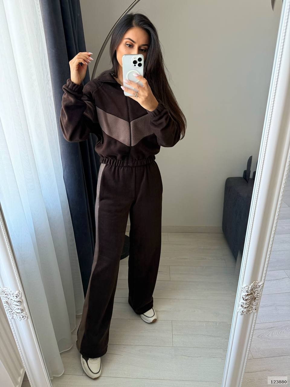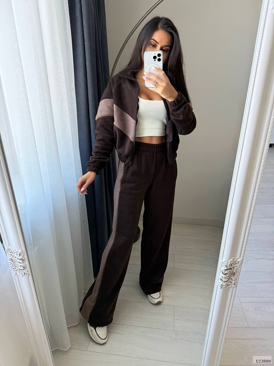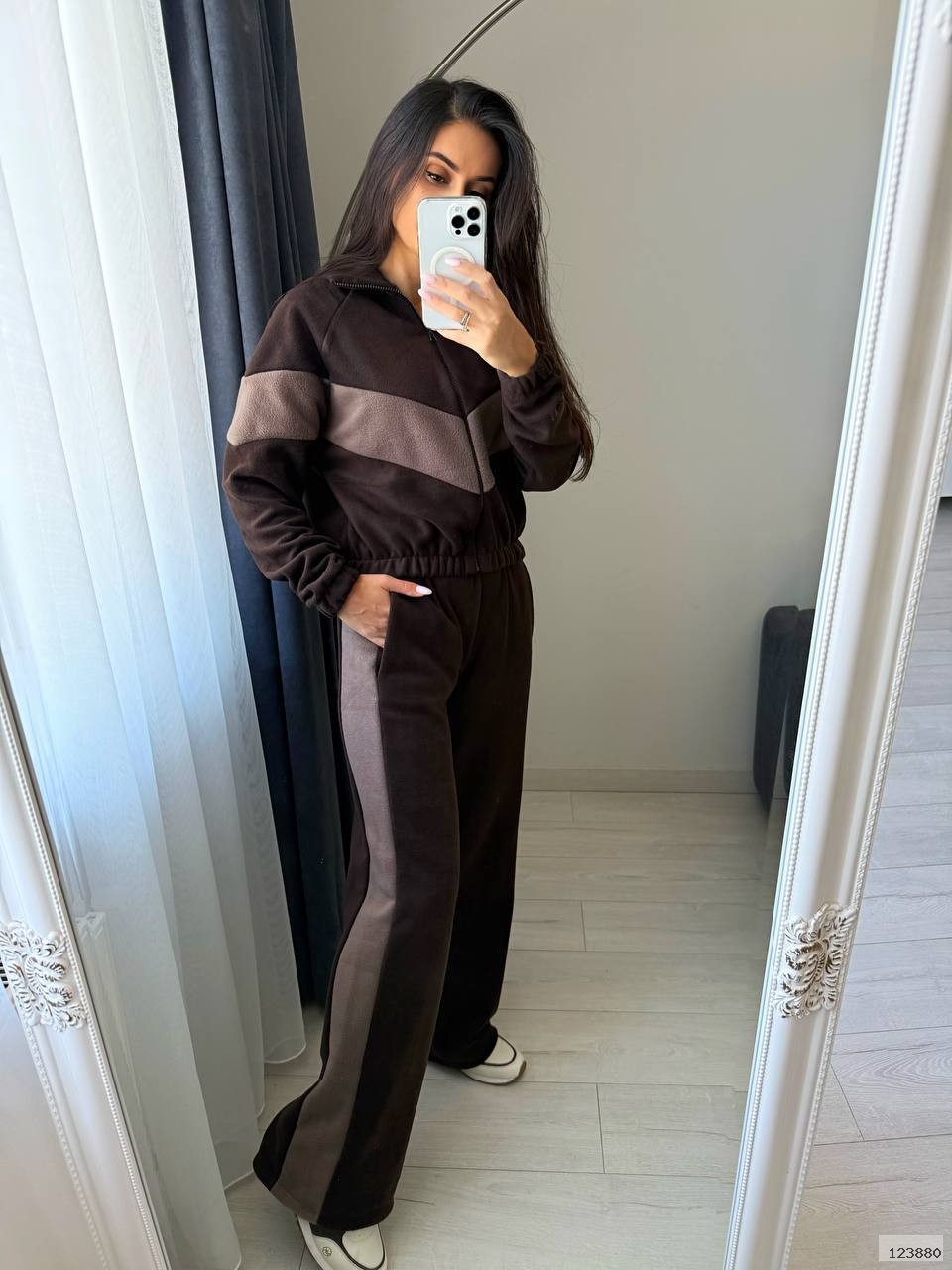 Ідеальний варіант для прогулянок, дому чи поїздок — м’який, комфортний та стильний. Кофта з блискавкою, прямі штани з високою посадкою та зручною резинкою на поясі. Комбінація кольорів додає образу динаміки.