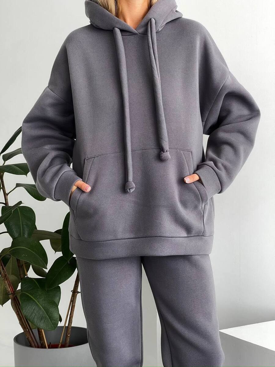 Оверсайз худі з капюшоном і зручними кишенями додає затишку, а штани на гумці з манжетами забезпечують комфорт і свободу рухів.