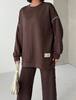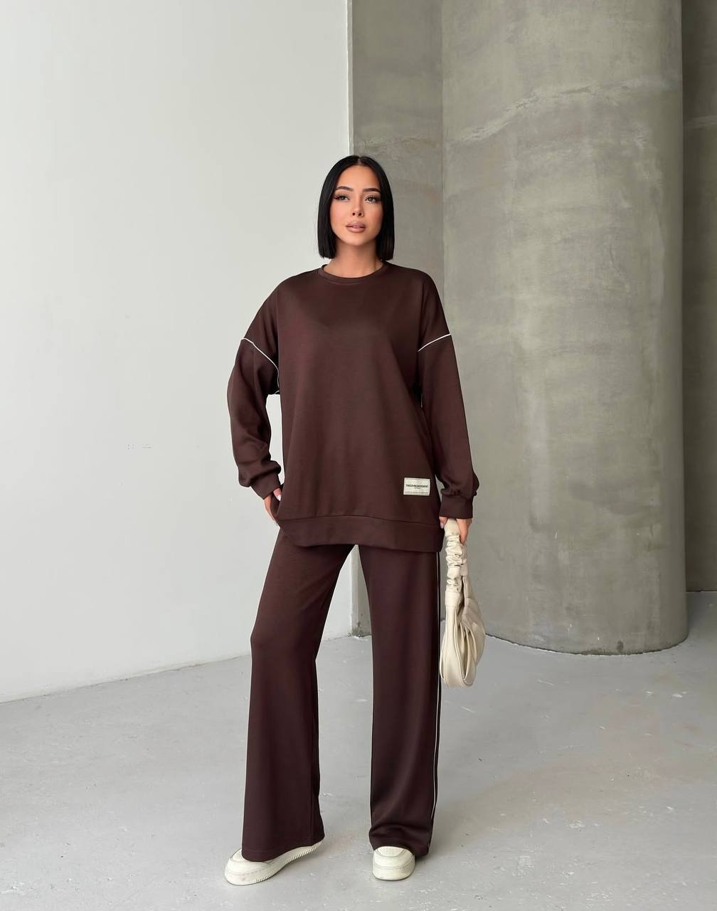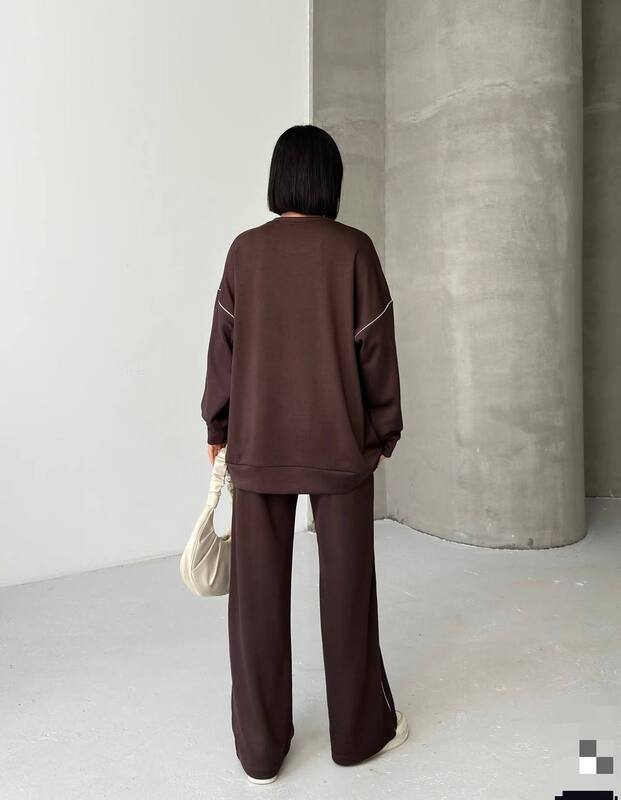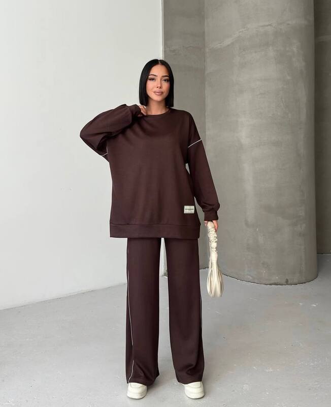 Костюм декорований нашивкою та кантом. Штани мають високу посадку, пояс на резинці