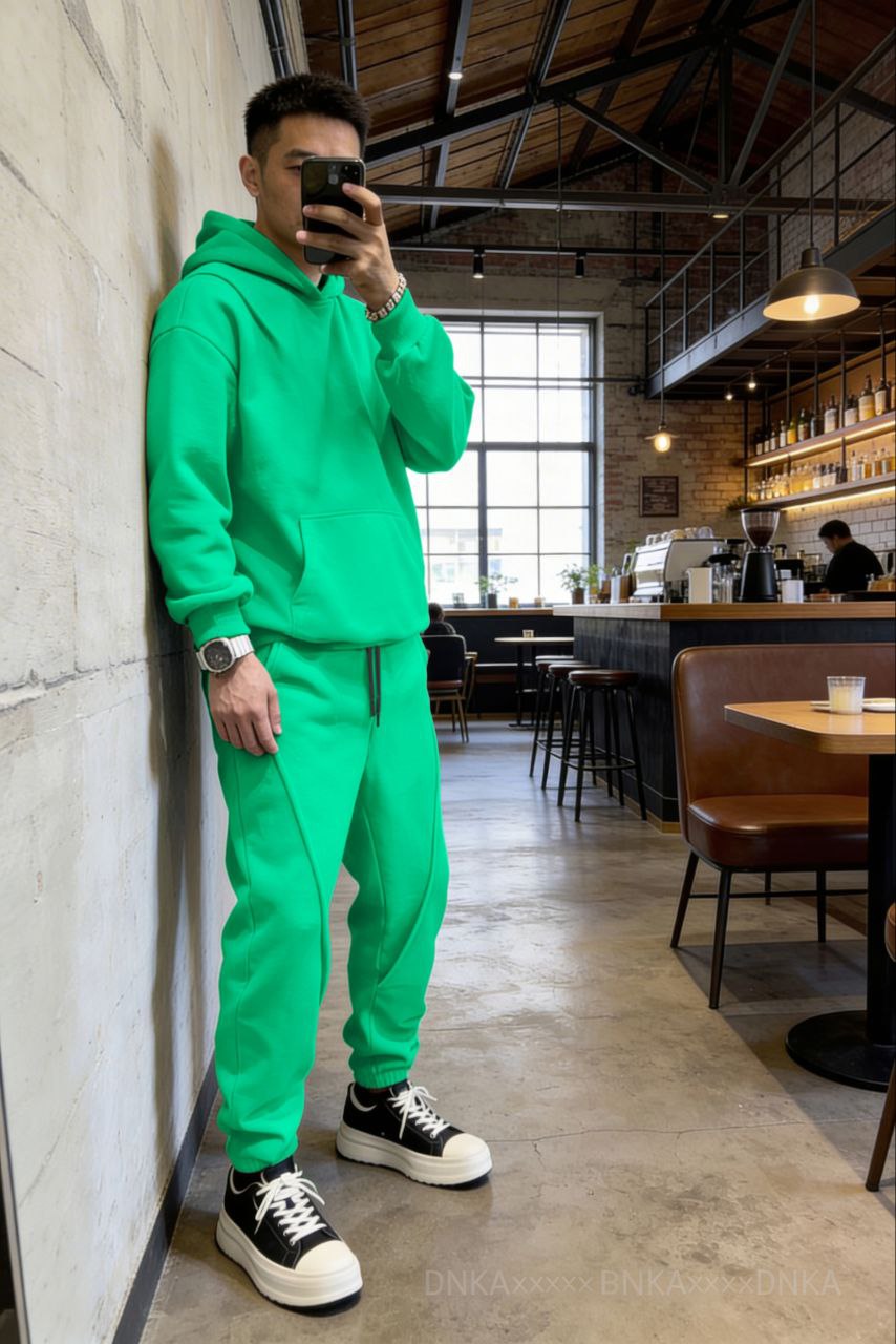 Худі має вільний крій та стильні декоративні шви.Штани з манжетами на резинці,з бічними кишенями та шнурком для регулювання талії