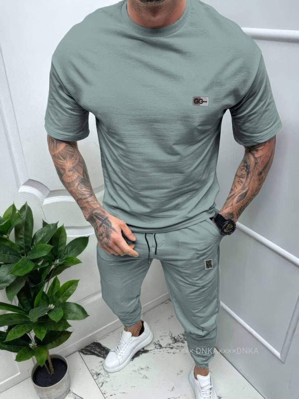 Футболка з силіконовою нашивкою на грудях,штани з еластичним поясом зі шнурком,бічними кишенями,силіконовою нашивкою та манжетами на резинці.