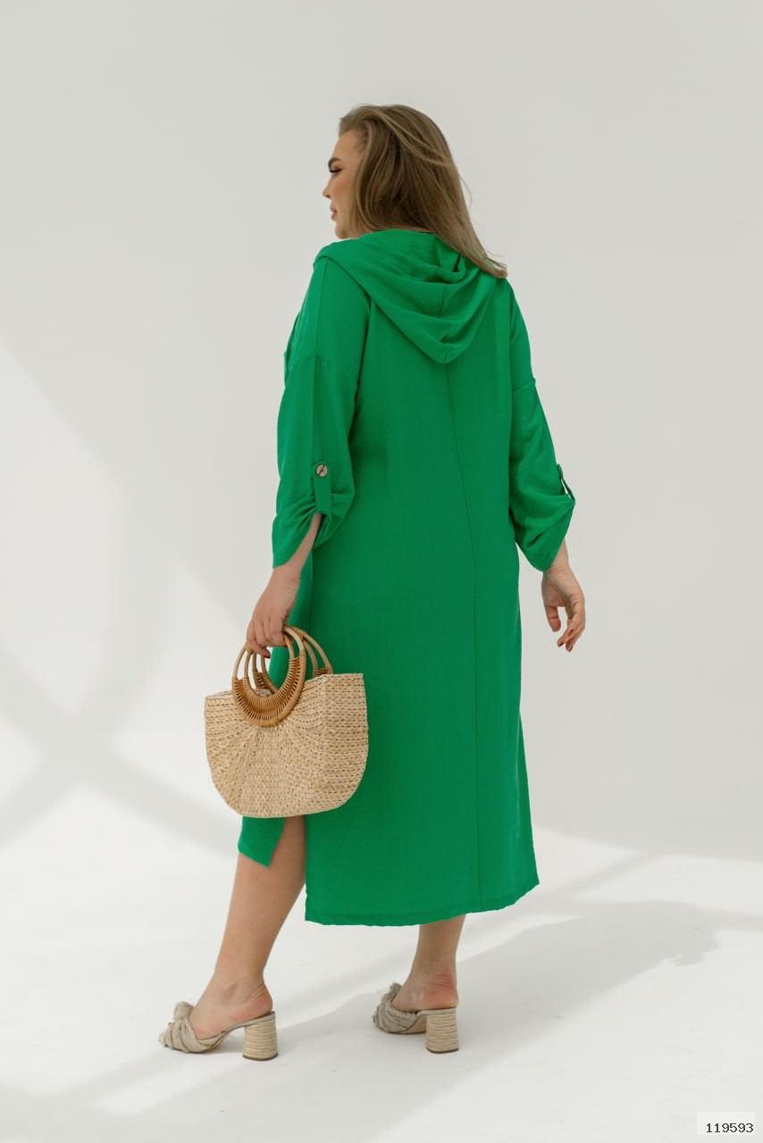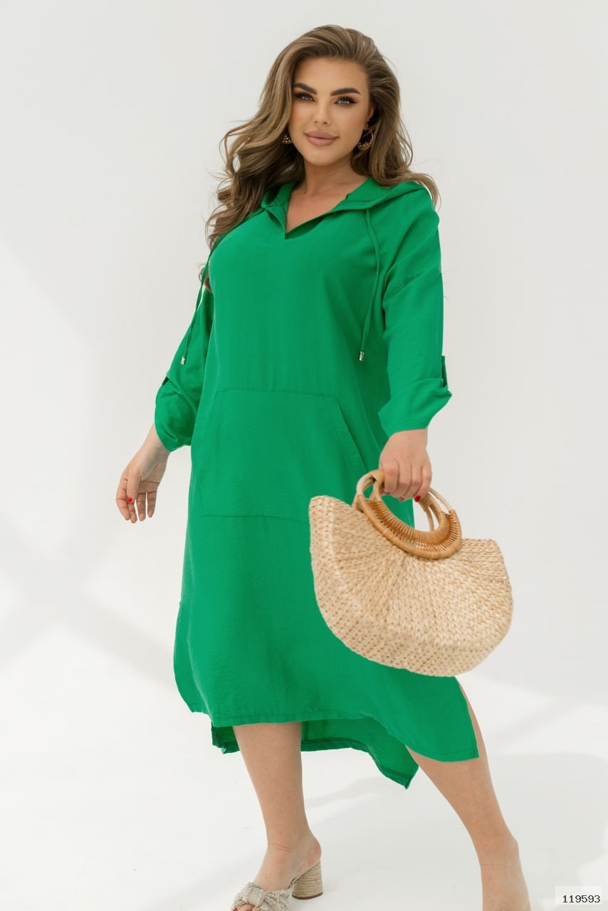 Сучасна та стильна сукня спортивного крою довжини максі зі спущеними плечима. Сукня вільного крою в стилі оверсайз з довгим рукавом, який доповнений не функціональною шлейкою на ґудзику. Ми зробили не великий виріз горловини V-форми, який переходить в капюшон . Дизайнери додали велику функціональну кишеню на передню частину сукні. Сукня подовжена по спинці, а по боковій частині подолу ми зробили розрізи які додають повітряності образу.